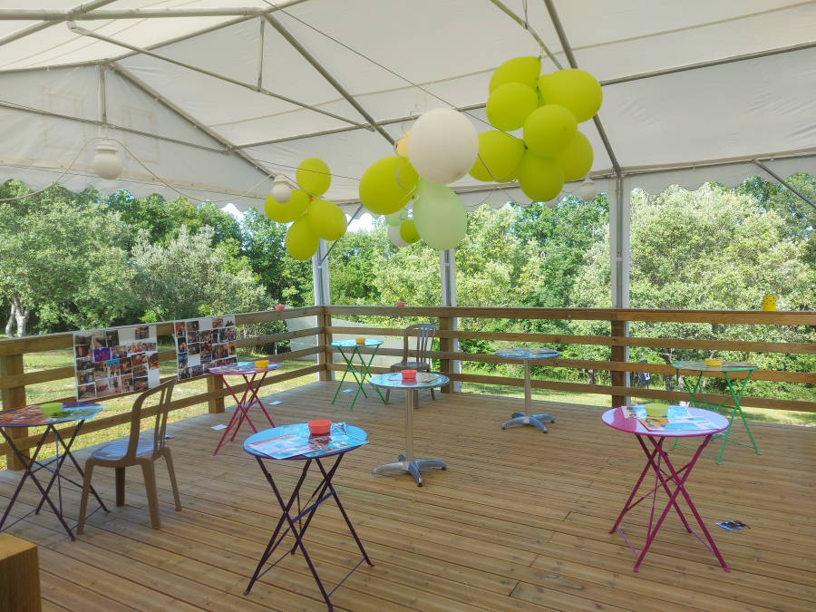. Un grand chapiteau de 96 m². Nous l'avons équipé et aménagé pour en faire un lieu fonctionnel et chaleureux. Sa structure modulable est une spécificité très appréciée. L'ouverture de certains panneaux donne un esprit "guinguette" , ambiance très appréciée pour les amateurs d'authenticité et de simplicité. Et si vous aussi, vous aimez l'ambiance guiguette, Hubert se fera un plaisir de jouer quelques notes d'accordéon au moment de votre choix !