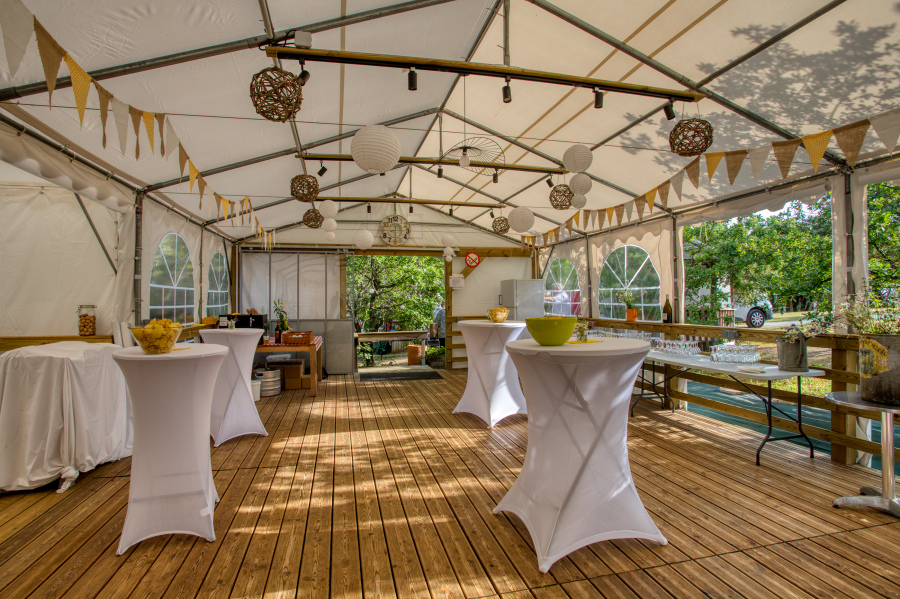 Pour l’organisation de vos événements tels que cousinades, anniversaires, mariages, réunions familiales, ou tout simplement retrouvailles entre amis nous vous proposons de vous réunir pour vos repas sous notre chapiteau de réception 96 m², aménagé pour en faire un lieu fonctionnel et chaleureux, chauffé, avec plancher bois et tout équipé avec tables, chaises, vaisselle, borne son, vidéo projecteur.