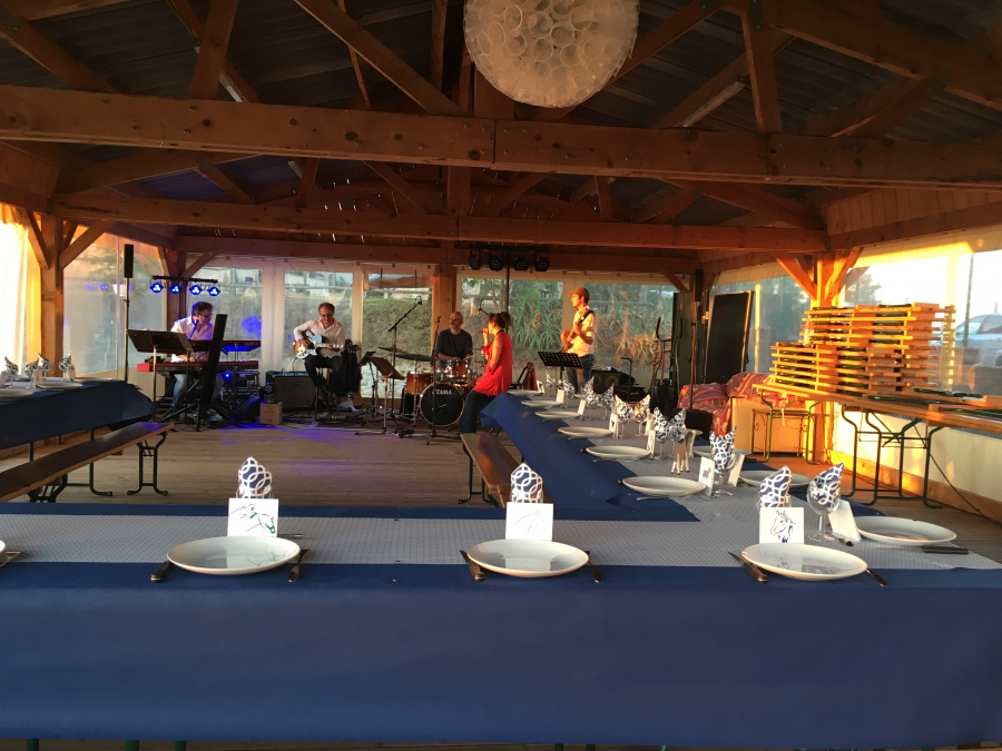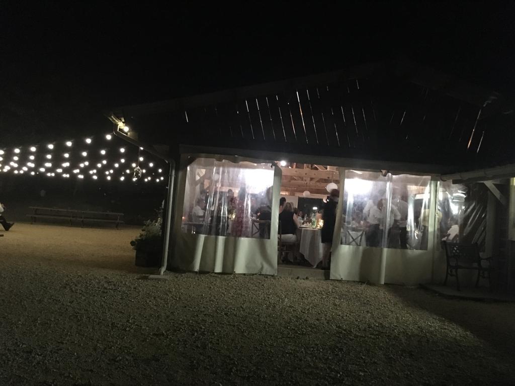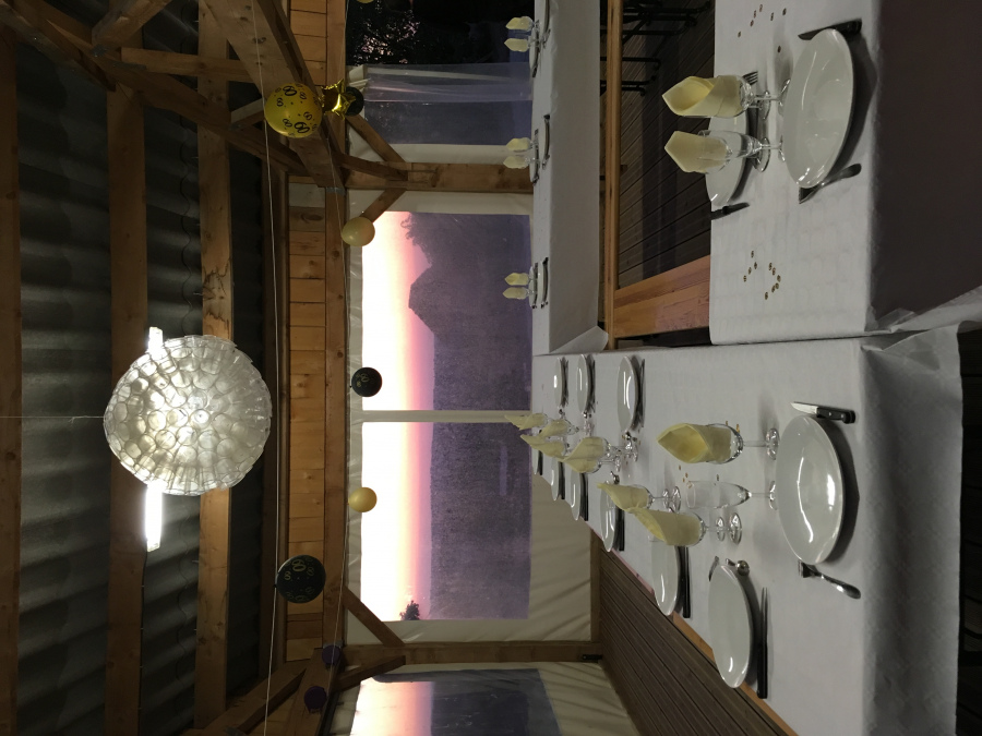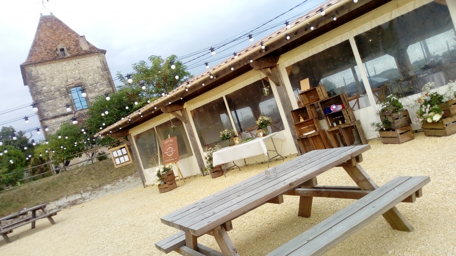 -La salle d'été 90 m²: prévue pour 100 personnes, entièrement ouvrable sur l’extérieur les beaux jours, vaisselle, tables, bancs, et cuisine d'été attenante.