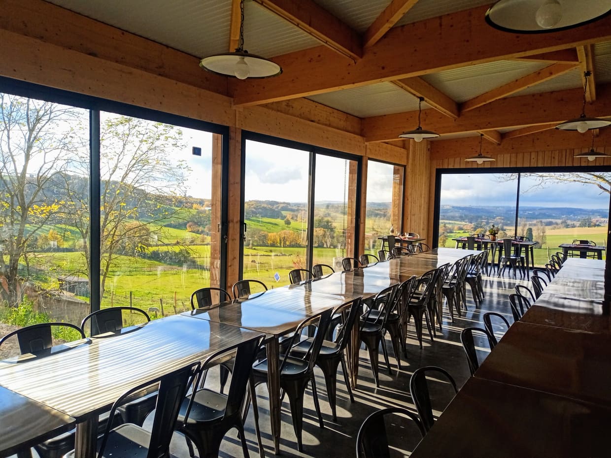 Salle vitrée avec vue panoramique sur la campagne, cheminée centrale pour les cuissons. Accès au jardin et terrasse.