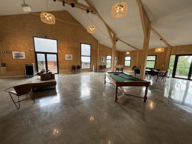 Au centre du domaine, une salle de réception de 180 m² est disponible pour accueillir jusqu'à 80 personnes assises. Elle est équipée d'un système de sonorisation, d'un vidéoprojecteur avec écran géant, de jeux (billard, baby-foot, ping-pong) et d'une cuisine semi-professionnelle. Cette salle est parfaite pour organiser mariages, anniversaires, séminaires ou autres événements.