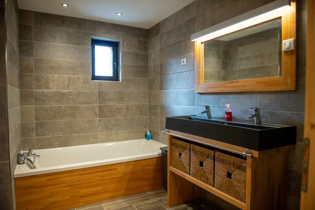 Le Buron : 430 m² pour 21 personnes, avec 7 chambres, 5 salles de bains, un jacuzzi extérieur, un sauna infrarouge et une baignoire balnéo.