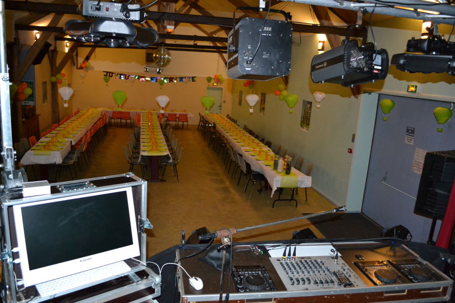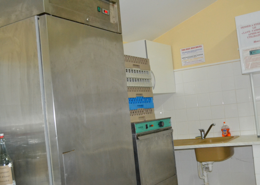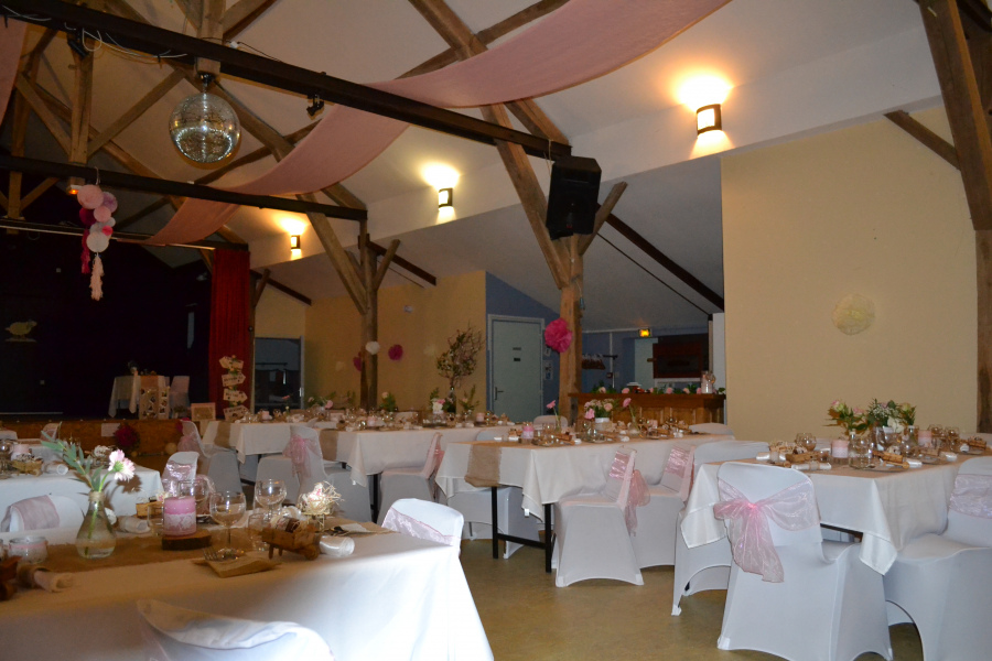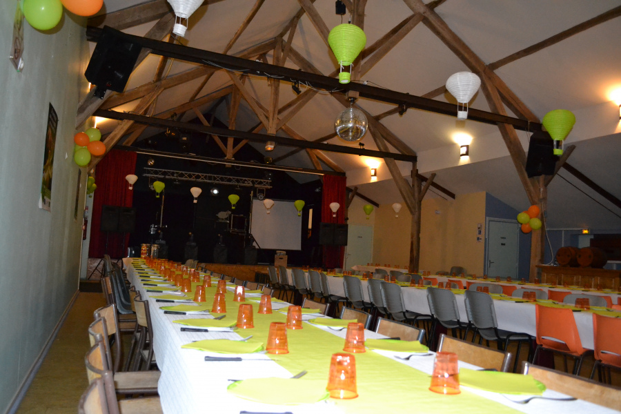 Salle au cadre sympathique avec poutres apparentes, équipée de tables, chaises, frigos, espace cuisine bien équipée, cuisinière, lave vaisselle, bacs de lavages, eau chaude. Scène avec rideaux. 2 WC, 1 urinoir, 2 lavabos.