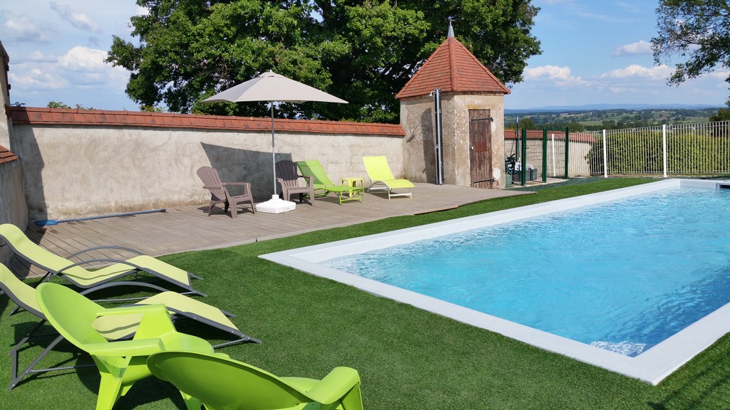 A l’extérieur, 3500m² de pelouse et cour avec piscine sécurisée de juin à septembre, vélos pour enfants et adultes, portique, barbecue …ni vis à vis, ni voisin, vous êtes seuls au monde.