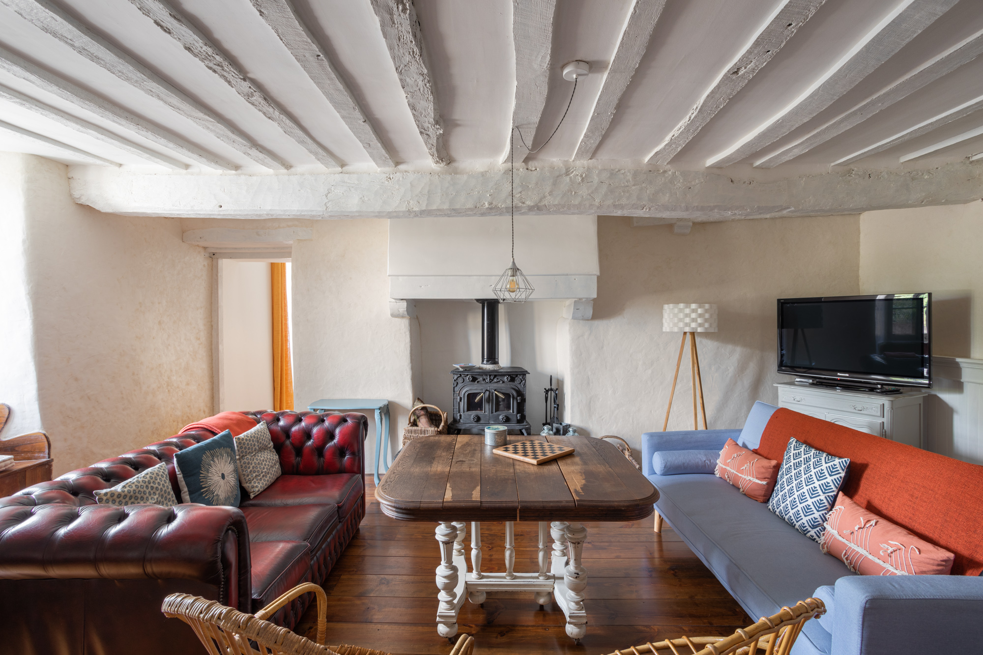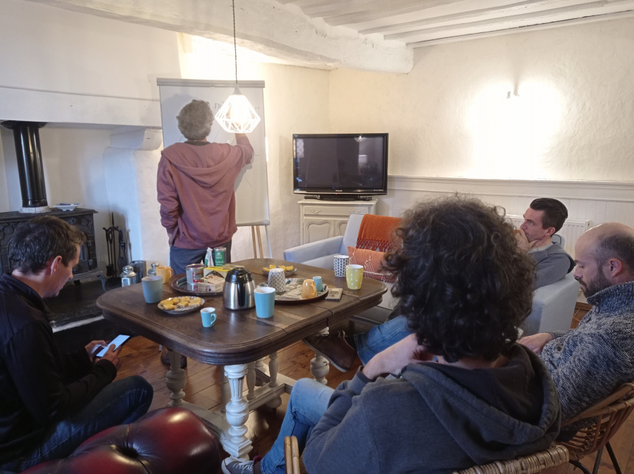 salons de nos gîtes.2 canapés, table basse et fauteuils, poêle à bois. Idéal séminaires en petit comité, au vert et comme à la maison!