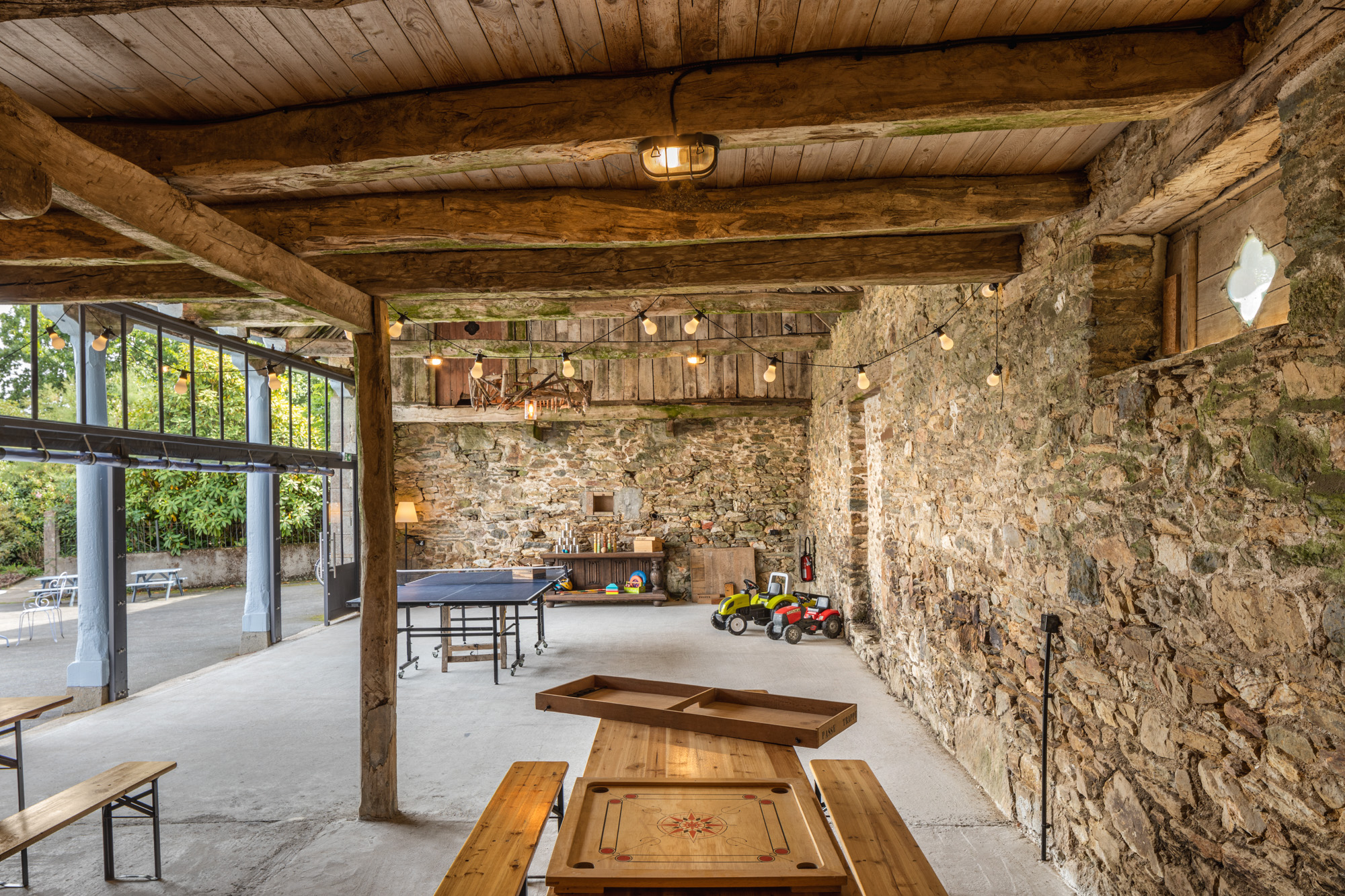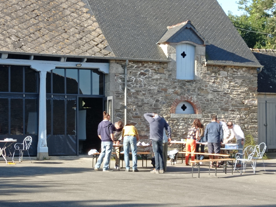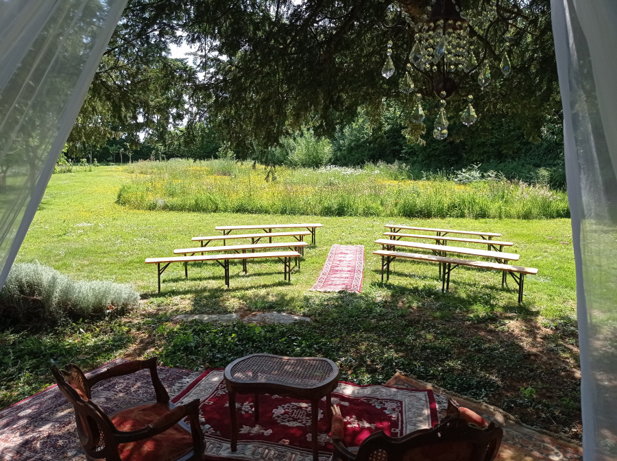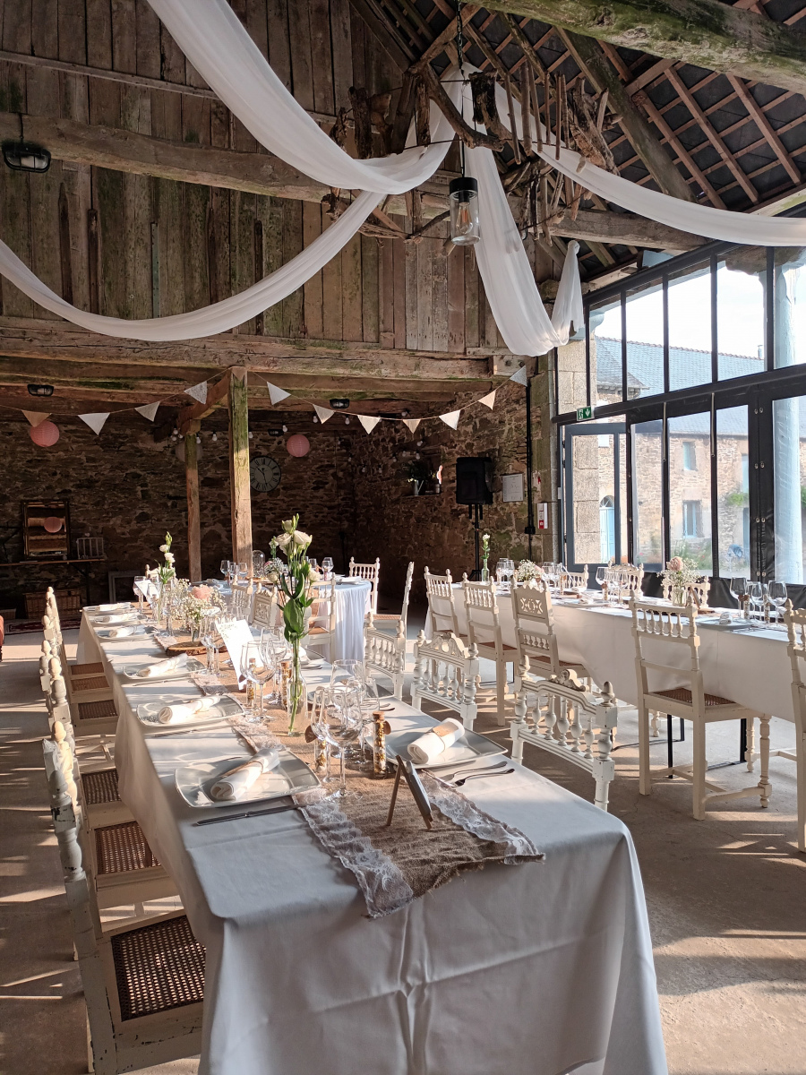 Grange du 19e siècle. 8 prises électriques, 2 prises extérieures, 4 prises traiteurs (dont 2 en triphasé), 7 tables rondes, 6 tables rectangles, 60 chaises.