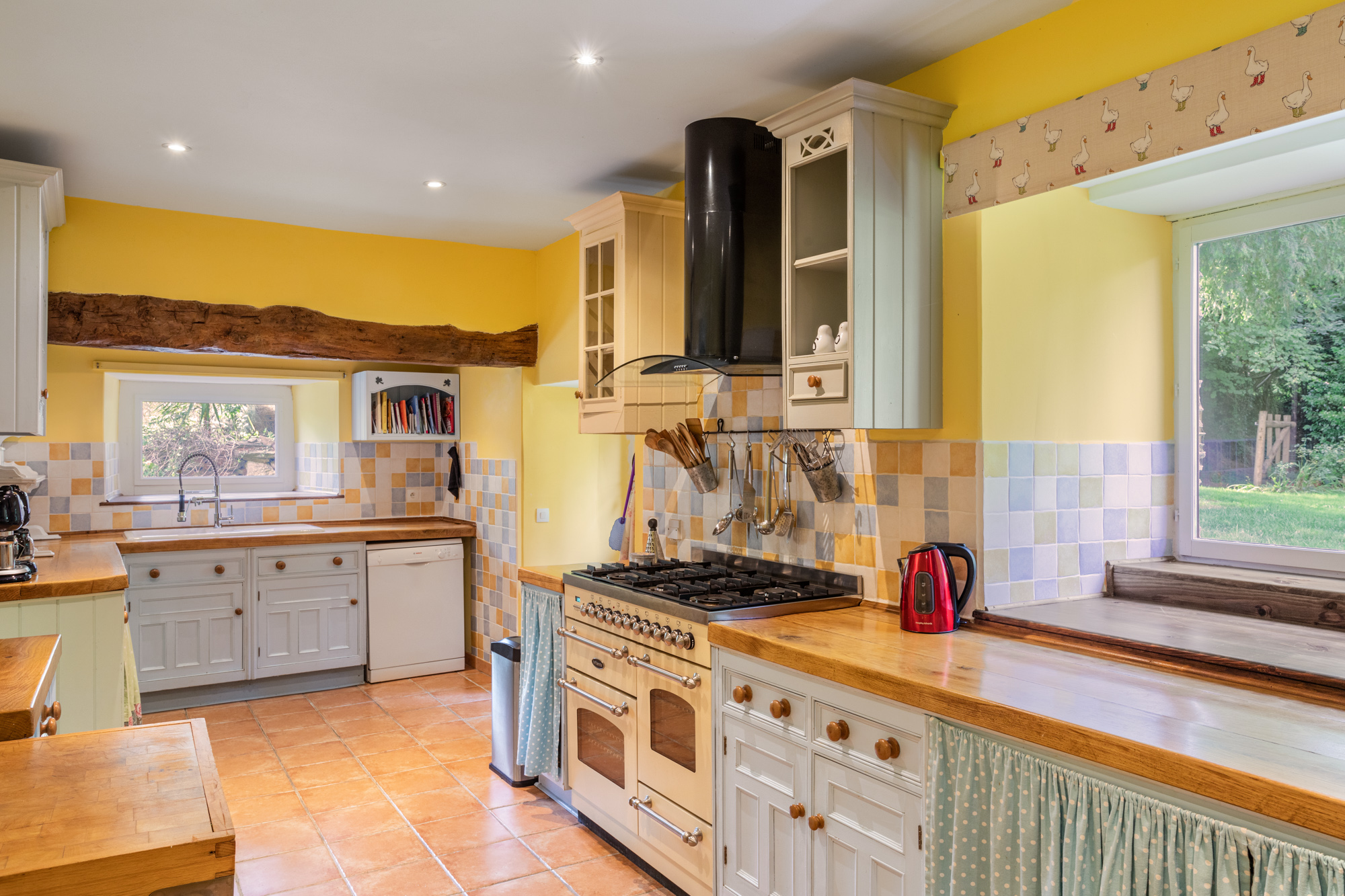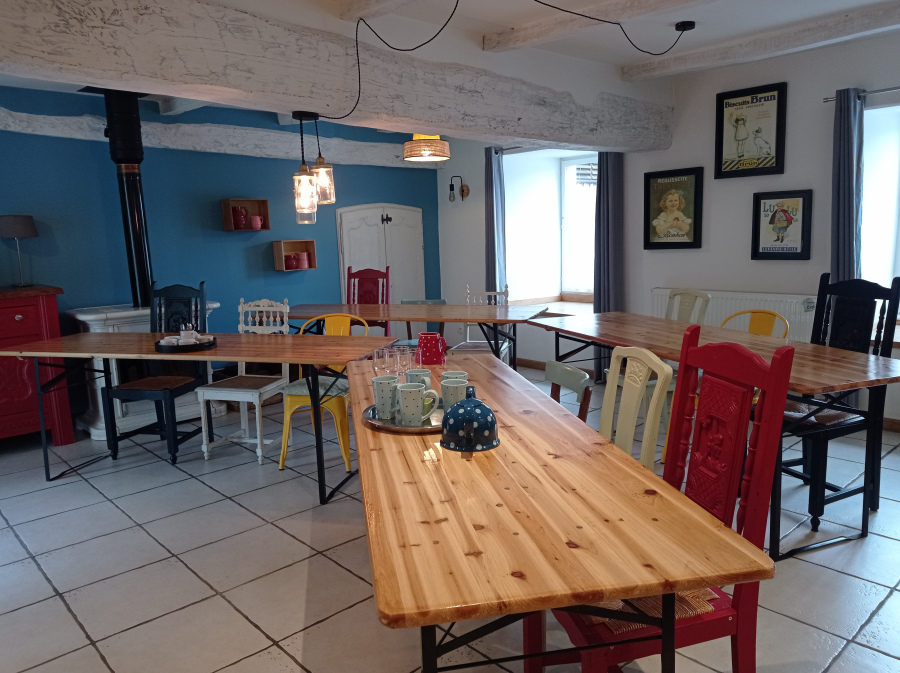 salles à manger de nos gîtes. Grande table pour 14 personnes. Possibilité de configuration type salle de classe ou U. Idéal séminaires en petit comité, au vert et comme à la maison!