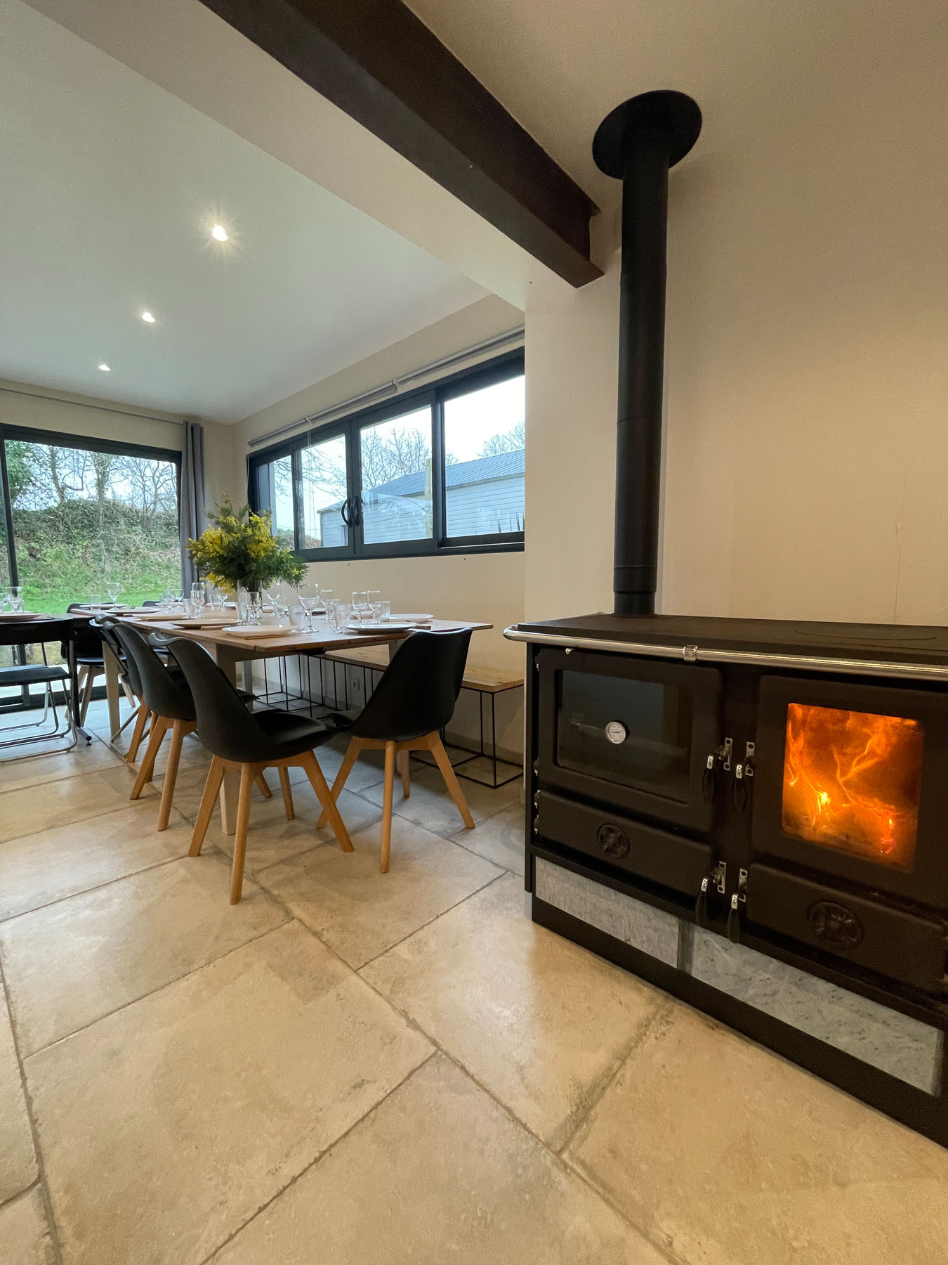 Spacieuse, la maison est dotée d'une grande cuisine ouverte sur le salon, de deux poêles à bois, de sept chambres et cinq salles de bain. Vous pouvez profiter de l'extérieur grâce à la terrasse indépendante et sans vis-à-vis. Le charme d'un belle maison de campagne à proximité de la mer pour vos prochaines vacances.