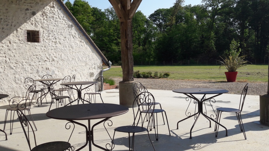 salle champêtre avec poutres apparentes et cheminée ouverte,bar, vestiaire, préau couvert de 60 m² attenant à la salle, toilettes handicapés, cuisine professionnelle,libre choix de traiteur, d'animateur, 5000m² d'espace vert, salon de jardin en fer forgé, ouvert toute l'année