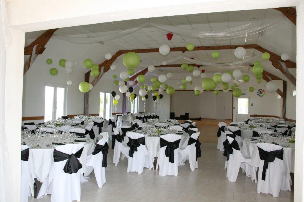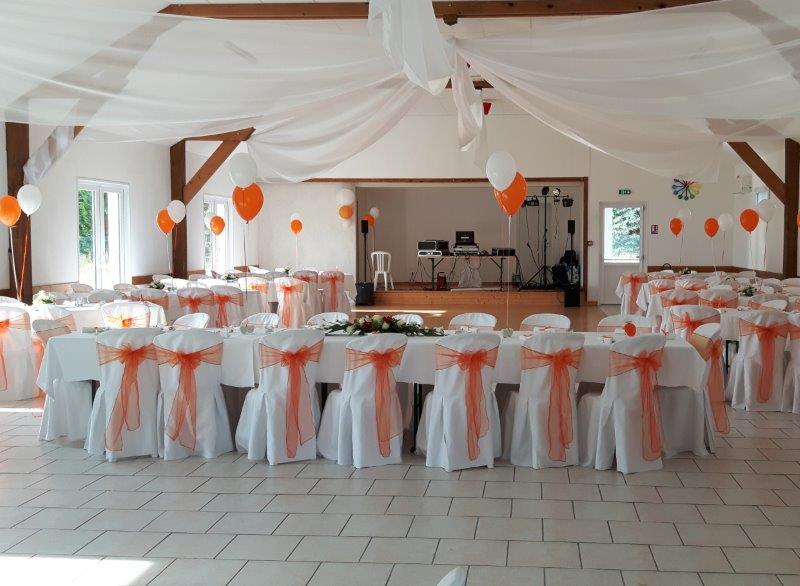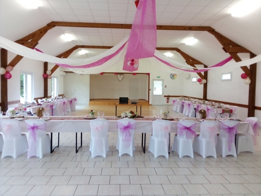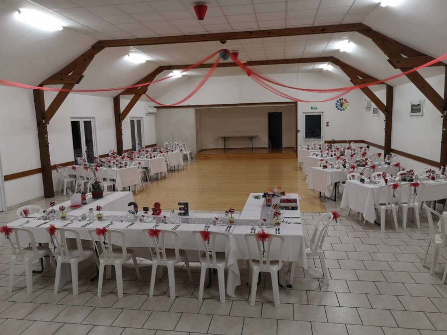 La salle de 188 m2 convient tout à fait pour les mariages et les fêtes familiales. Elle est très lumineuse avec ses grandes portes-fenêtres donnant sur le parc et la piste de danse est un atout. L'acoustique est excellente. La salle est équipée avec 120 chaises de réception et 19 tables rectangulaires. La scène avec coulisses permet au D.J. d'installer son matériel et d'animer la soirée.