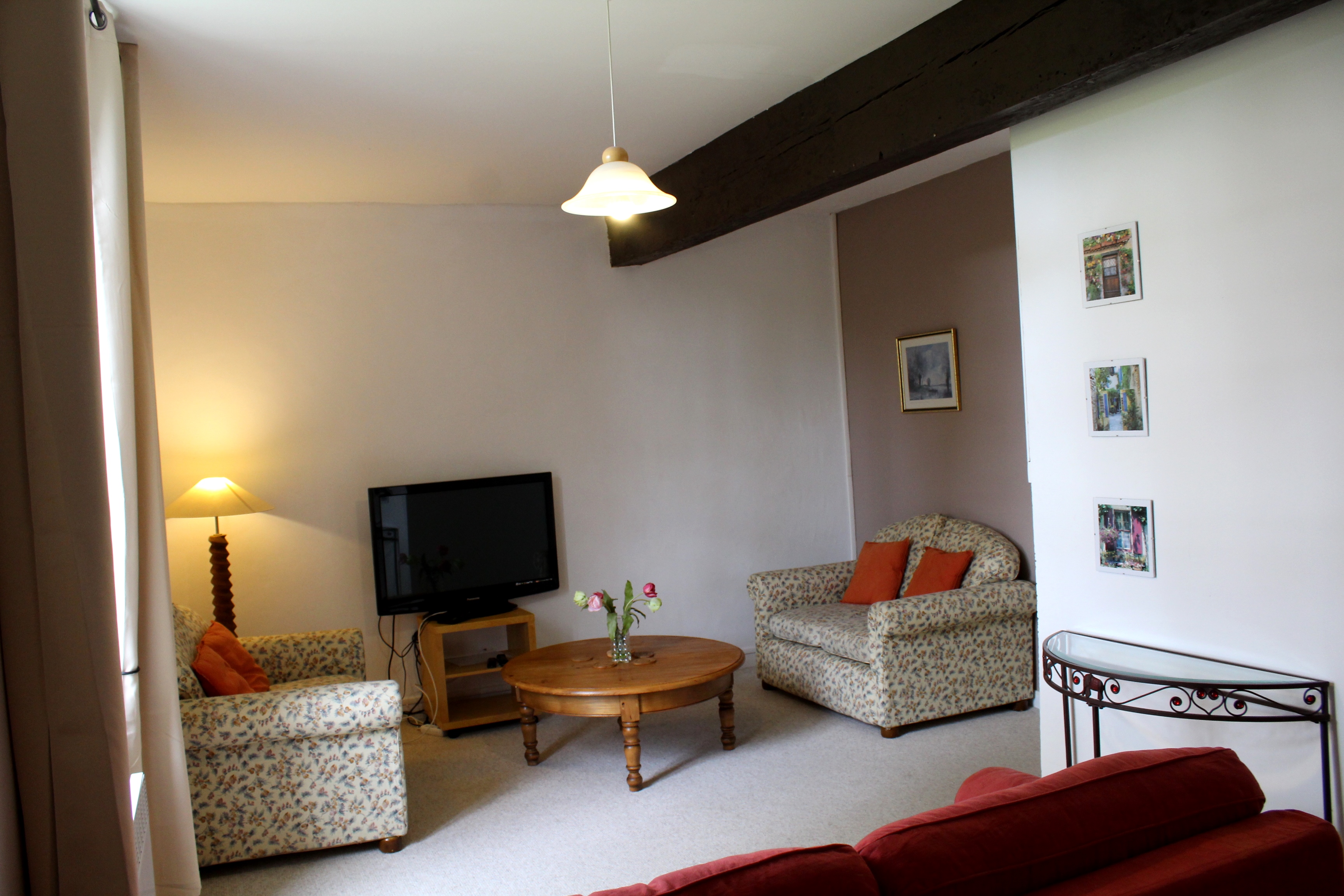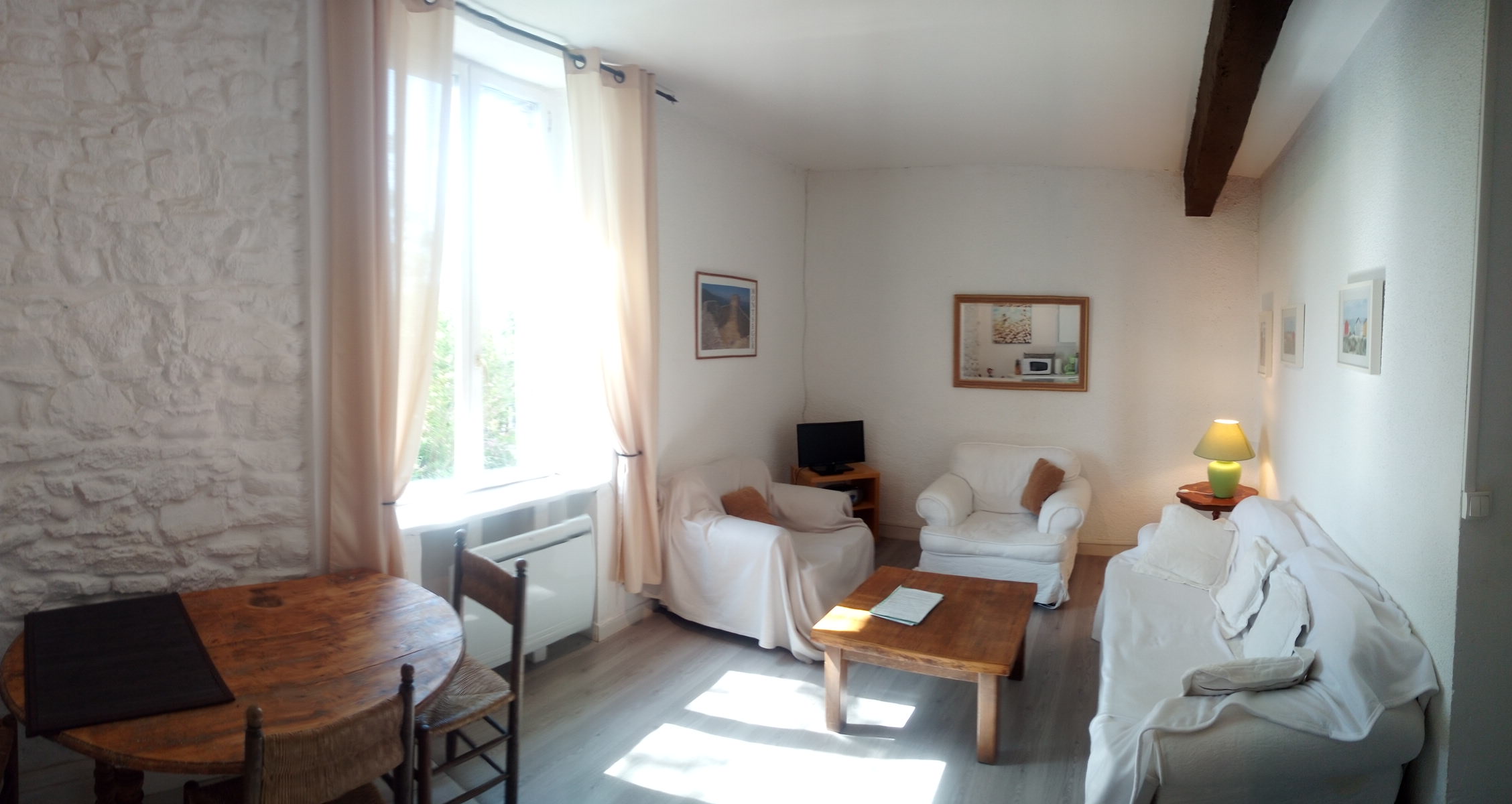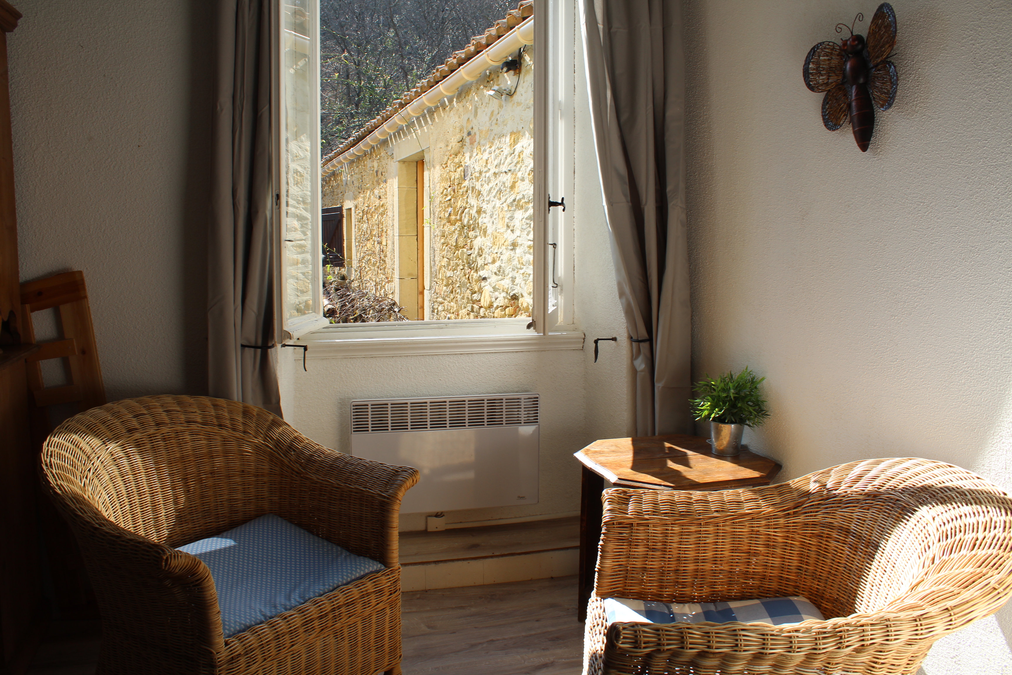 Le gite offre une belle vue vers le village. Le logement se compose : salon/salle à manger/cuisine, avec de confortables canapé et fauteuils, table et chaises, cuisinière avec grill, réfrigérateur, bouilloire,