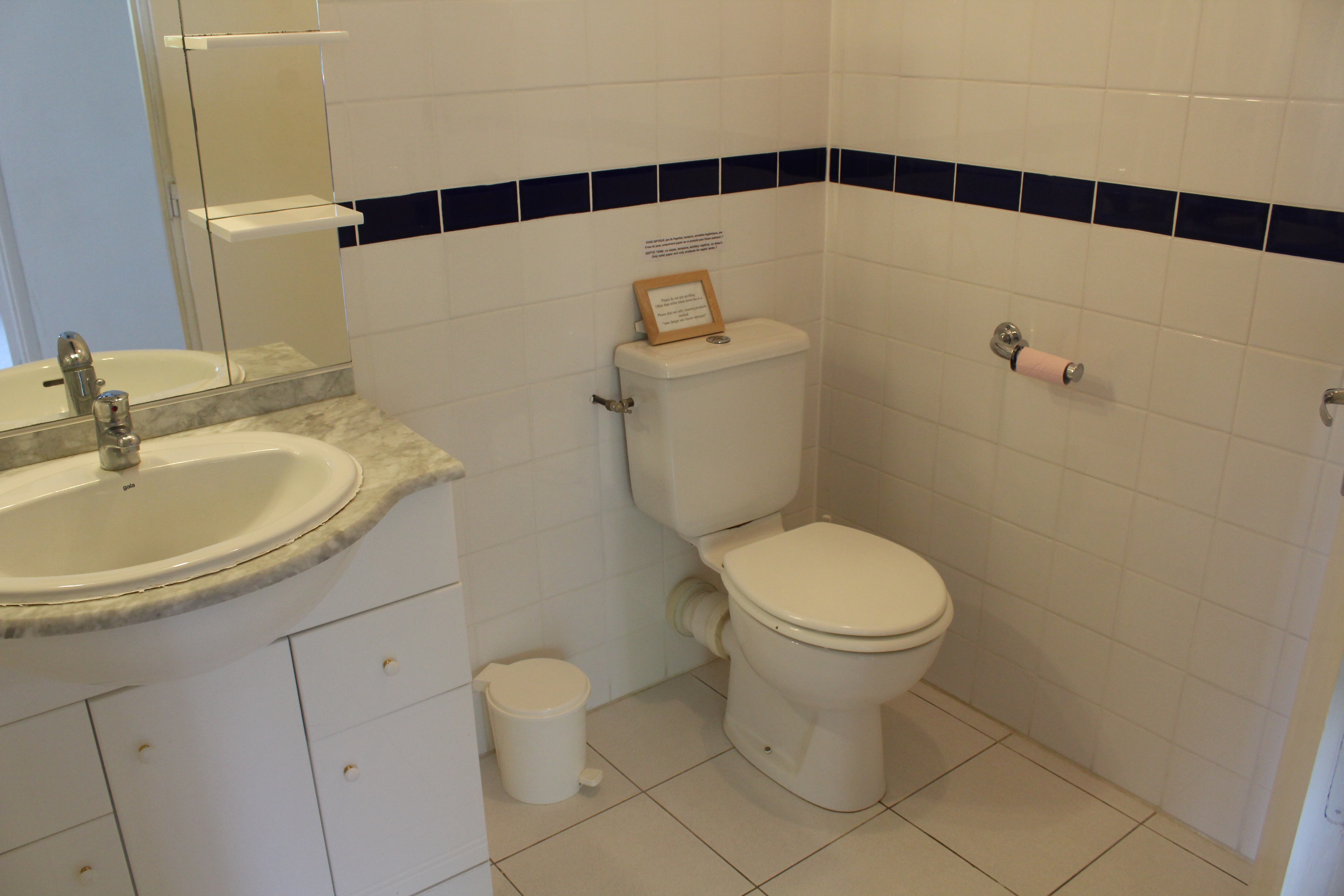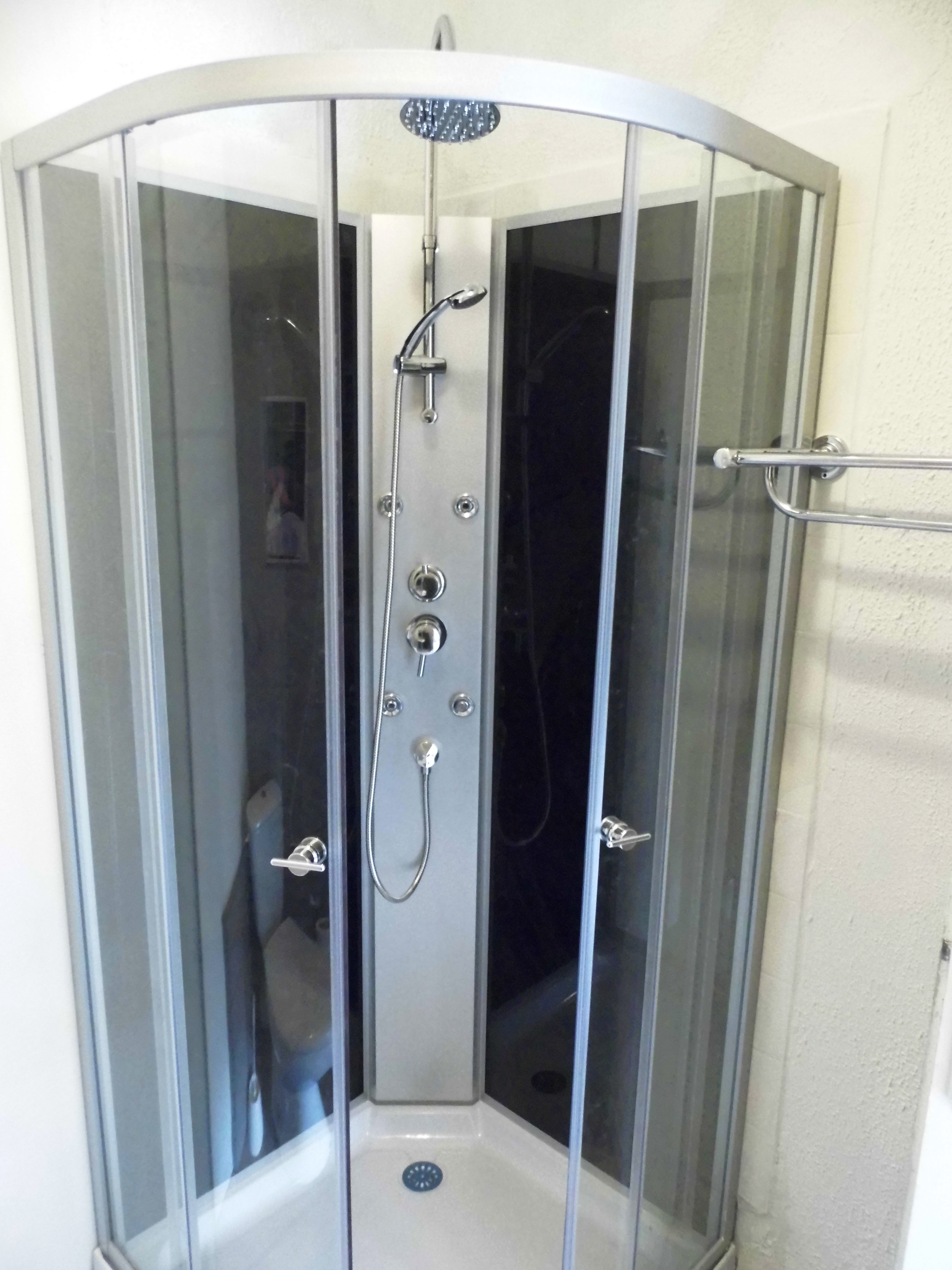 Salle d'eau avec douche thermostatique et sèche cheveux.