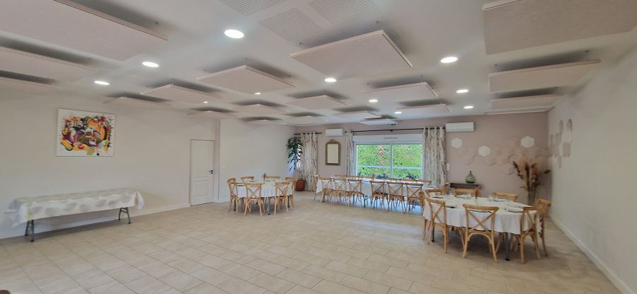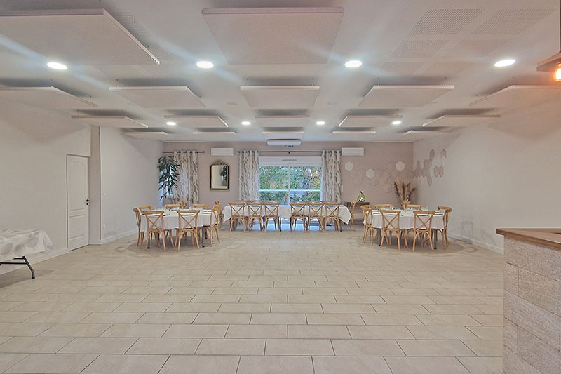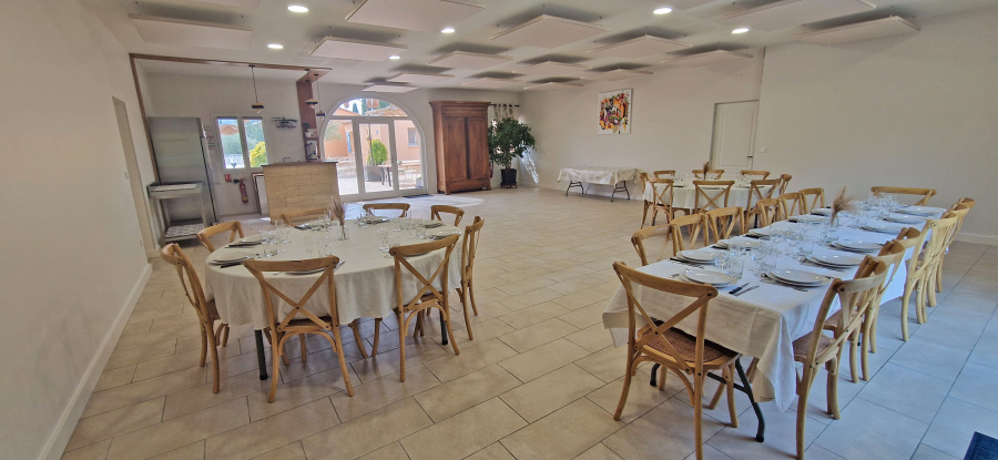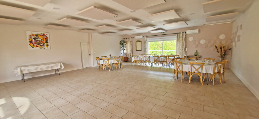 La salle commune de réception de 100m² (rénovée en janvier 2025) est entièrement équipée (tables rondes (6), rectangulaire (3), chaises (48)), d’un coin bar équipé (lave vaisselle, un armoire réfrigérée 900l, un évier, un percolateur 48 tasses), vous pourrez alors facilement gérer vos événements et ainsi y prendre tous vos repas en commun. Elle peut accueillir jusqu'à 48 personnes assises et debout.