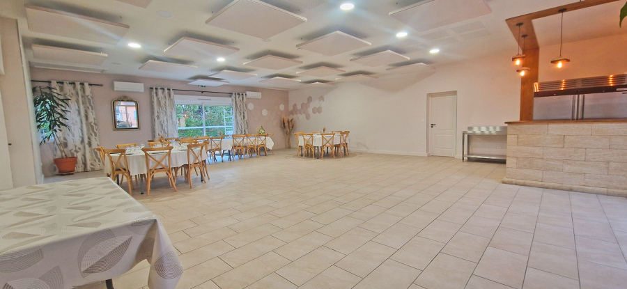 La salle commune de réception de 100m² est entièrement équipée (tables rondes (6), rectangulaire (3), chaises (48)), d’un coin bar équipé (lave vaisselle, un armoire réfrigérée 900l, un évier, un percolateur 48 tasses), vous pourrez alors facilement gérer vos événements et ainsi y prendre tous vos repas en commun. Elle peut accueillir jusqu'à 48 personnes assises et debout.