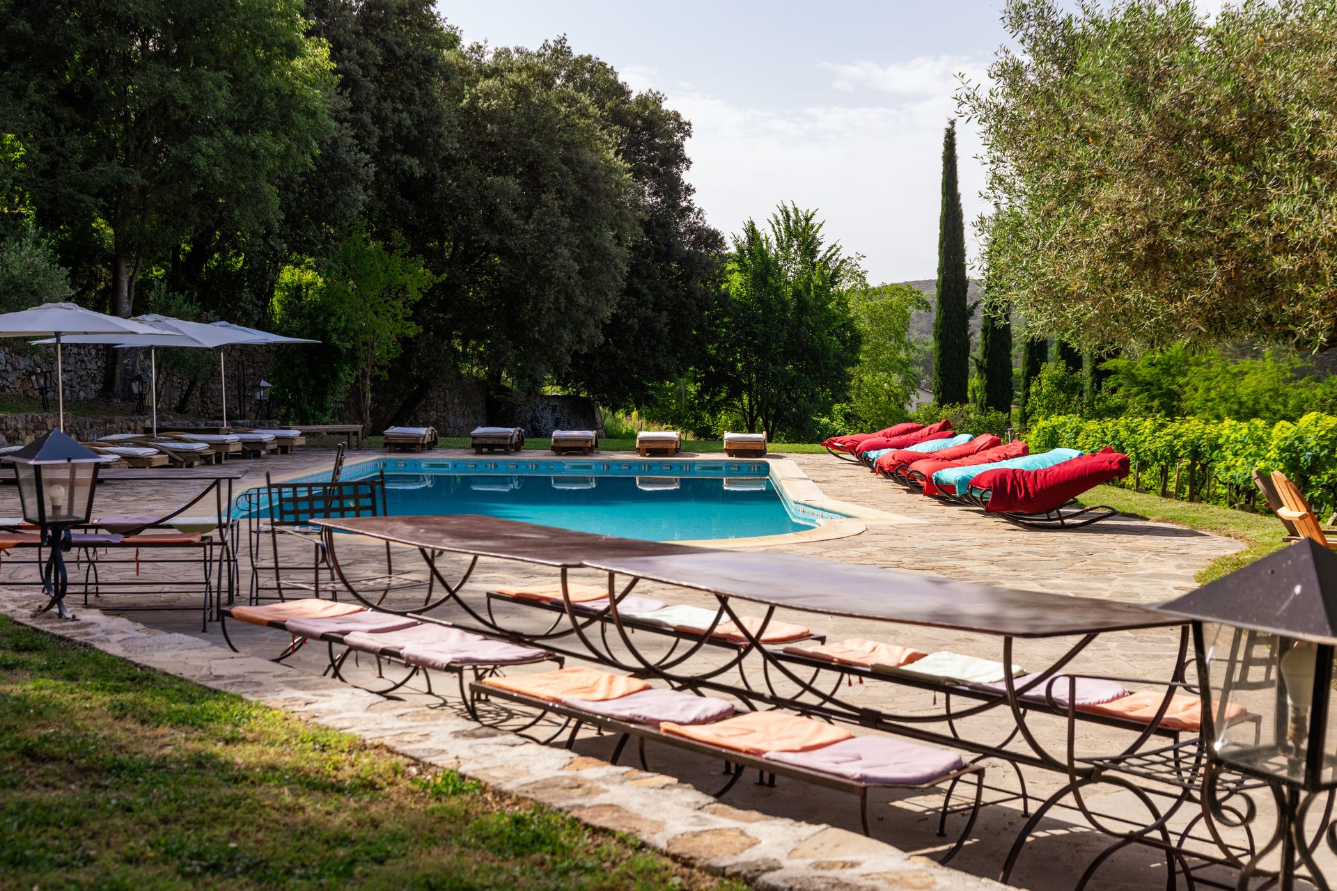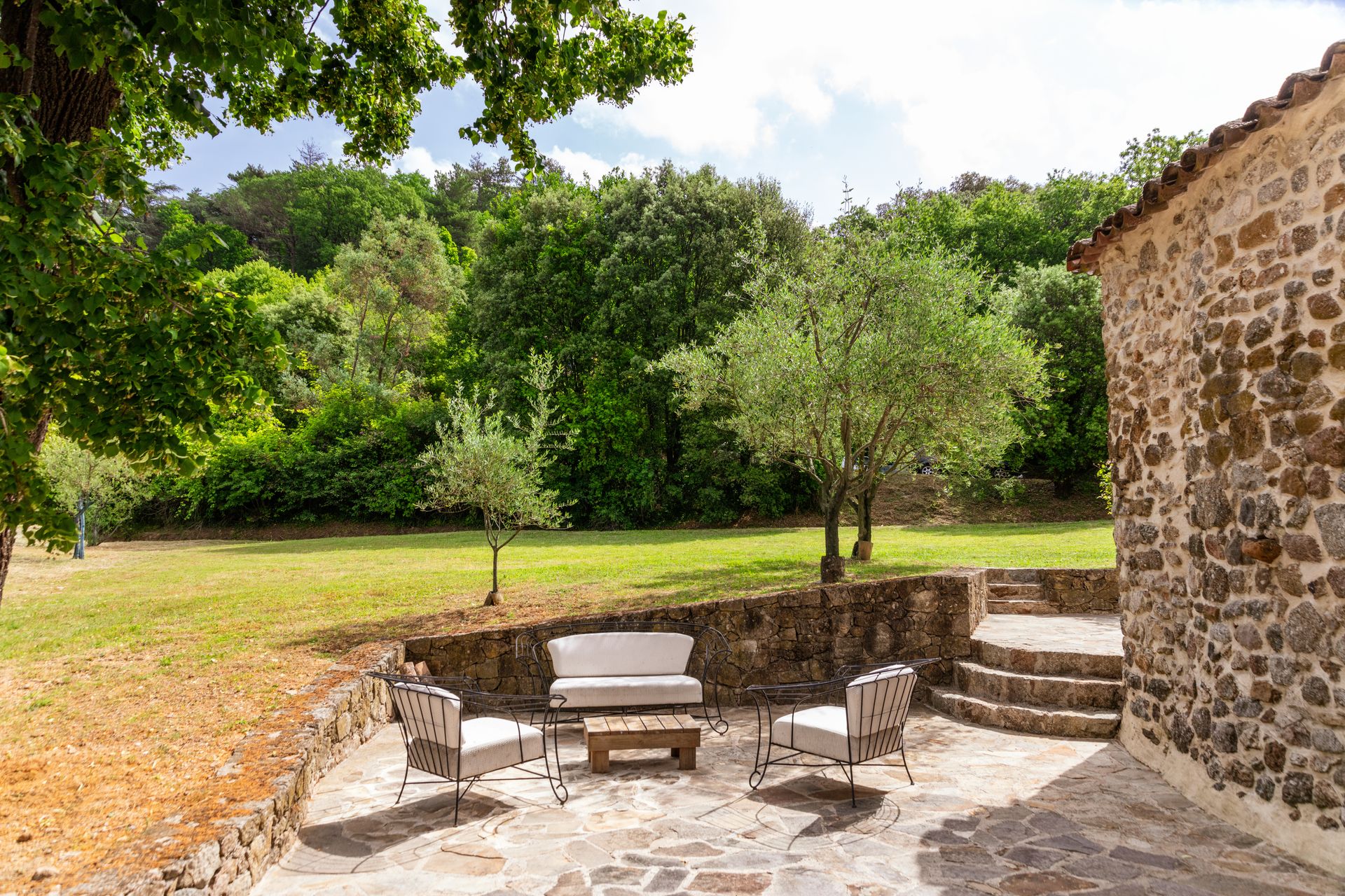 Une grande terrasse salon (avec fauteuils et lits de plage) donnant sur le salon oriental et sur les bois. Une chambre avec une baignoire et un petit salon supplémentaire donnant sur la grande cour et sur la piscine