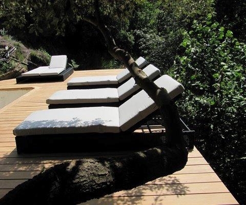 Et la piscine insolite, suspendue, originale dans les arbres, rafraichissante mais néanmoins agréable avec sa plage en bois et ses confortables bains de soleil.