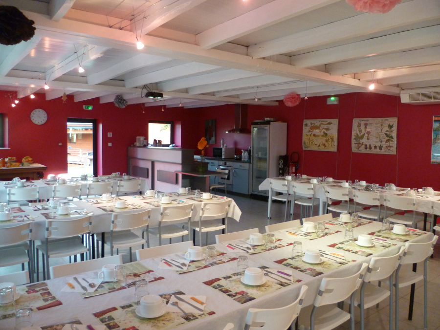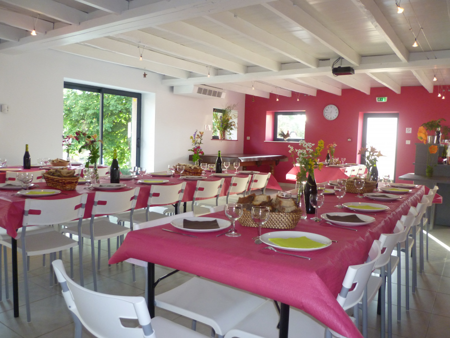 Au moment des repas, la salle principale peut accueillir jusqu'à 50 personnes. Elle est équipée d'une cuisine aménagée mais un traiteur local peut venir livrer les repas pour plus de facilité.