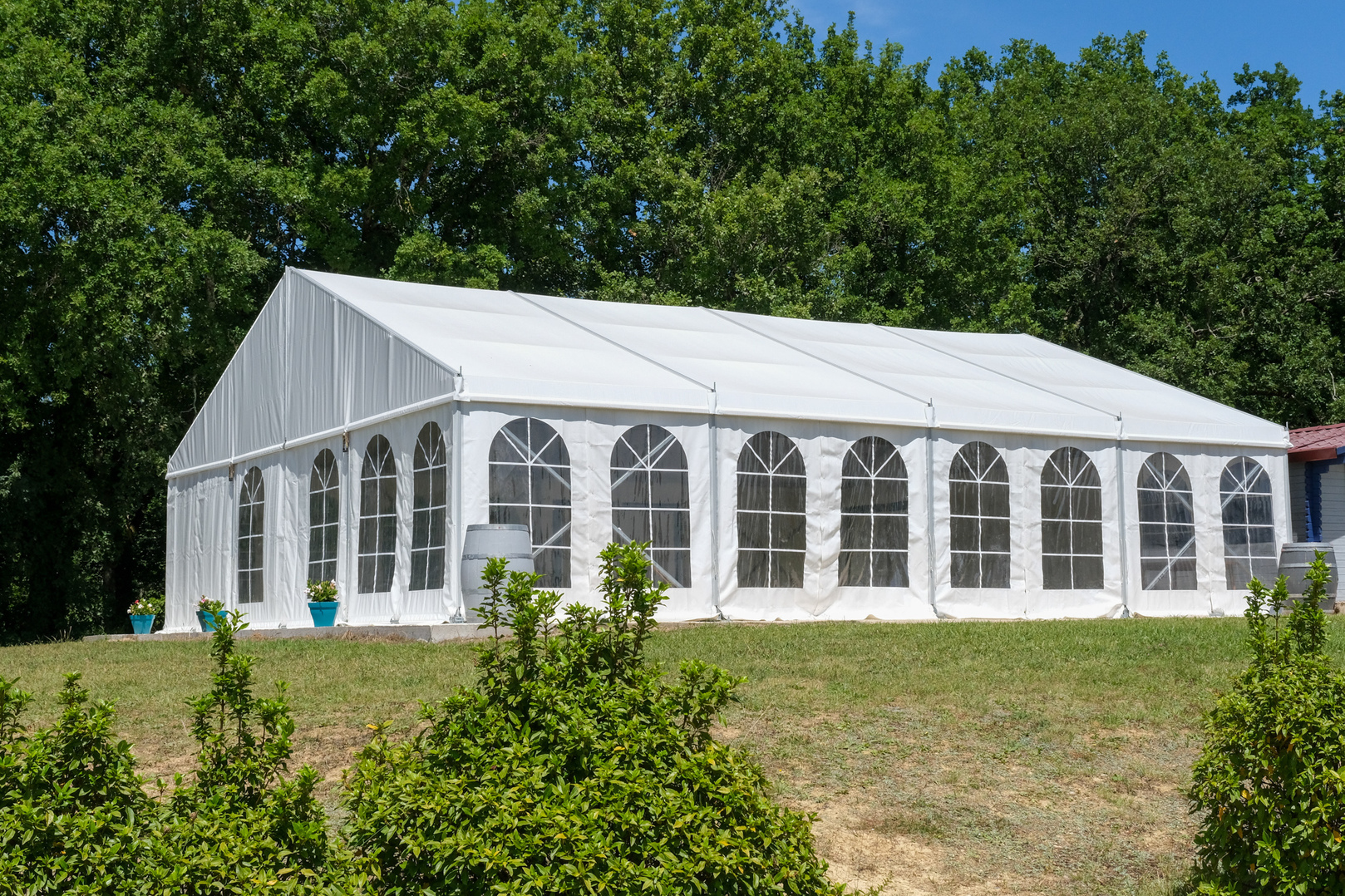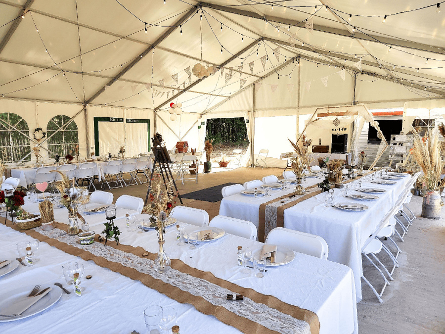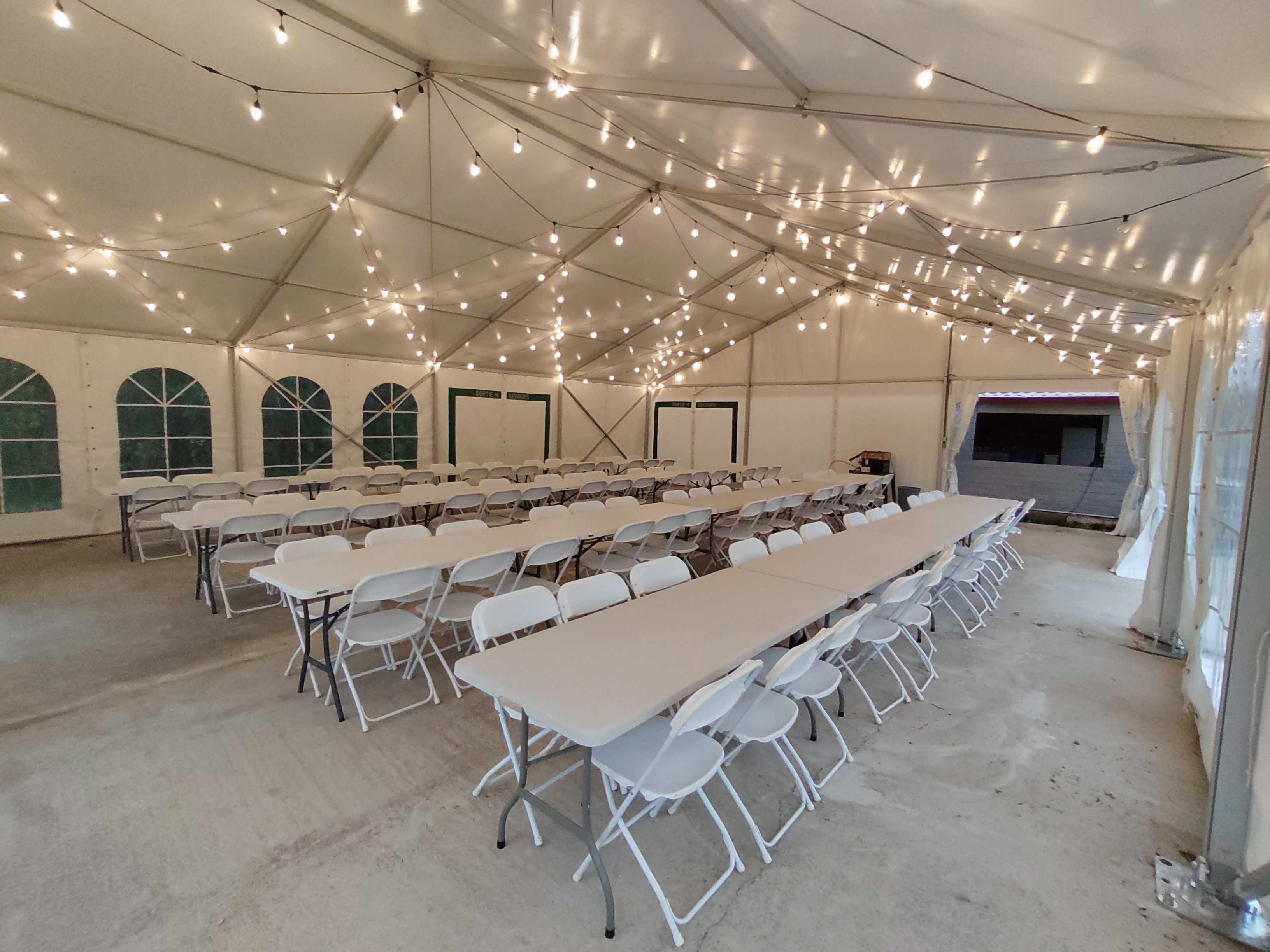 Idéal pour les événements dans un cadre plus "champêtre", notre barnum saura vous séduire par sa localisation donnant directement sur notre grand terrain. De par sa proximité avec les aires de loisirs (pétanque, volley-ball, ping-pong, piscine) et de pique-nique (barbecues et tables), il sera adapté pour toutes vos activités de plein air. Sa superficie de 120m² vous permettra d'y installer jusqu'à 120 places assises.