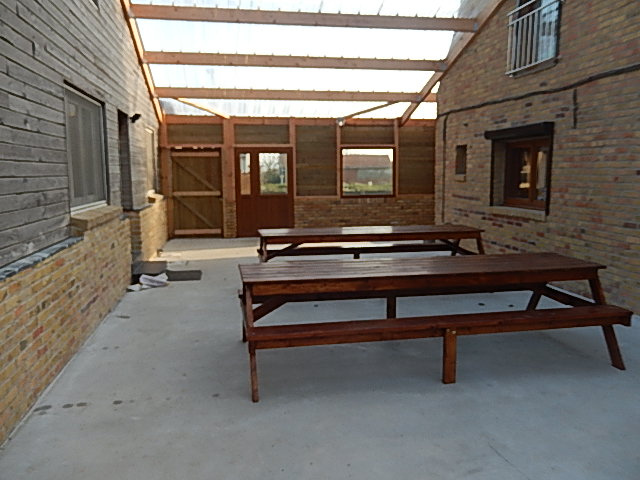 Par ailleurs, les deux gîtes sont raccordés par un préau de 100 m². Des tables de pique-nique sont à disposition sous ce préau.