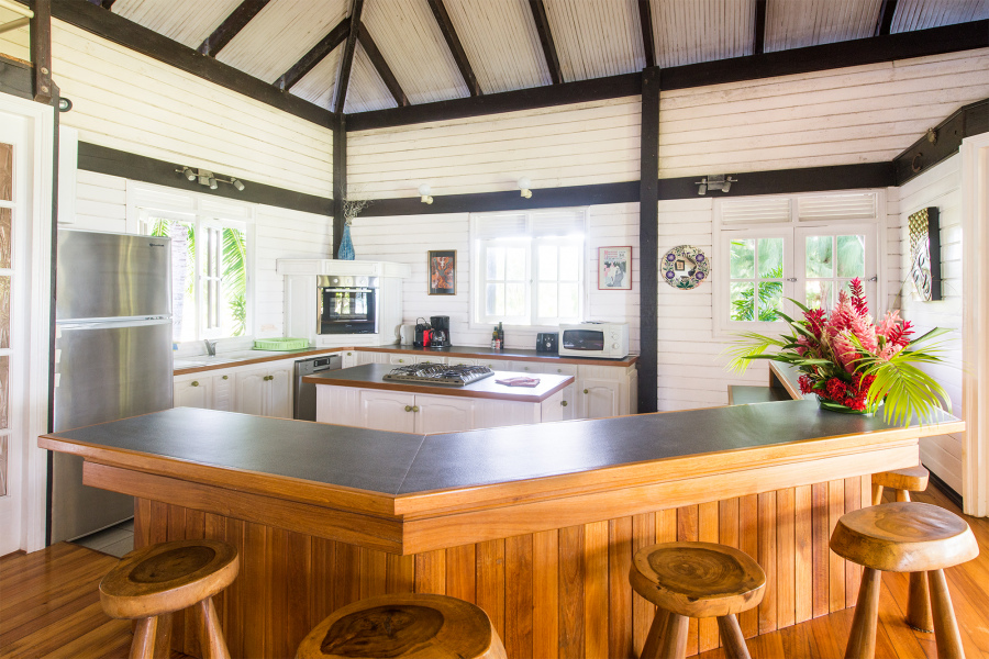 La Villa d’une surface de 400 m² possède des espaces de vie spacieux : un grand séjour, 3 chambres et 3 salles de bain, une cuisine ouverte et une grande mezzanine. Vous pourrez savourer vos repas à l’ombre sur la terrasse ou dans le jardin (tables et chaises abritées du soleil), ou déguster un cocktail au bar côté mer tout en profitant de la magnifique vue sur le lagon et le coucher de soleil.