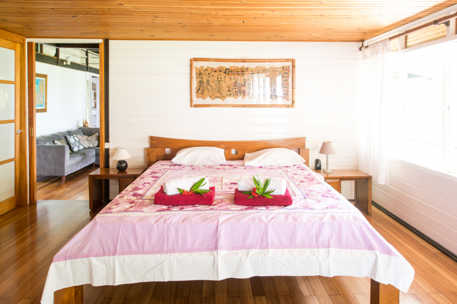 La villa jouit d'un emplacement exceptionnel, à quelques minutes seulement de l'incontournable spot des raies et des requins à pointes noires, de la passe de surf, des motu et de deux restaurants de plage.