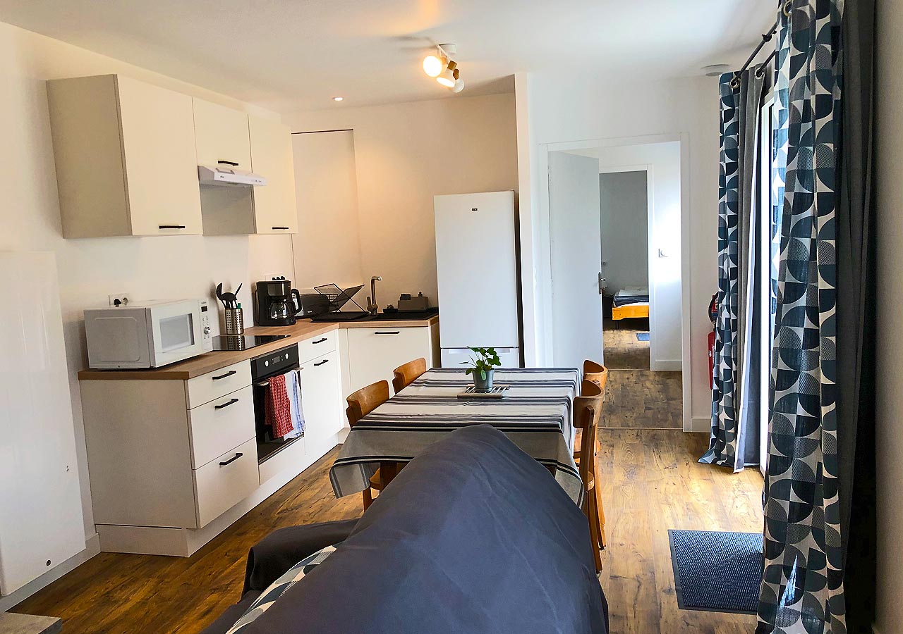 Le gîte principal est une grande maison de campagne, en forme de L de 12 pièces, rénovée avec des matériaux chauds (pierres, bois, grès). On y trouve 4 chambres + 1 dortoir, 4 salles d'eau, 5 WC, 1 salle de séjour, 1 salon, 2 cuisines, 2 salles d'activités et de jeux, 1 véranda.