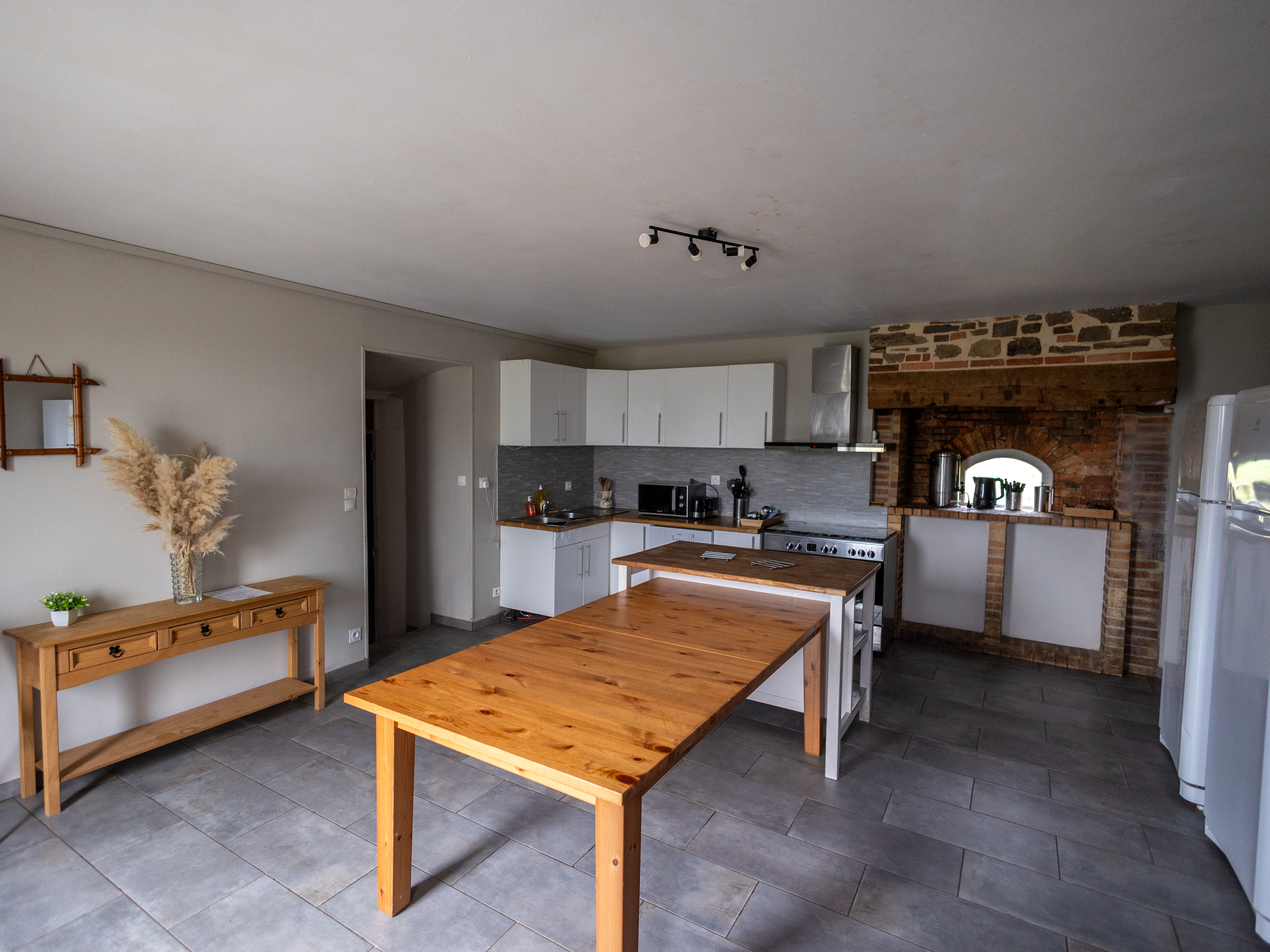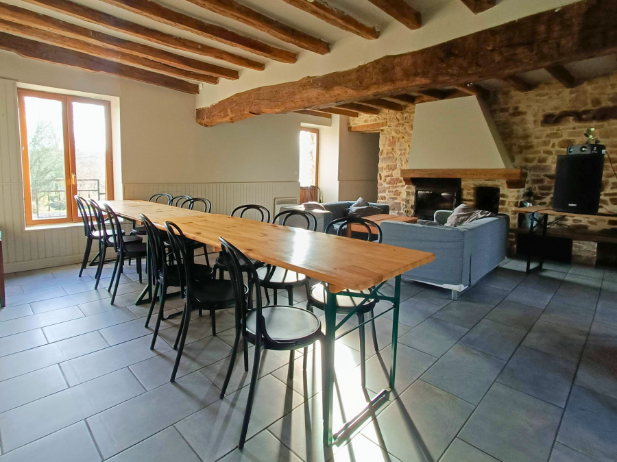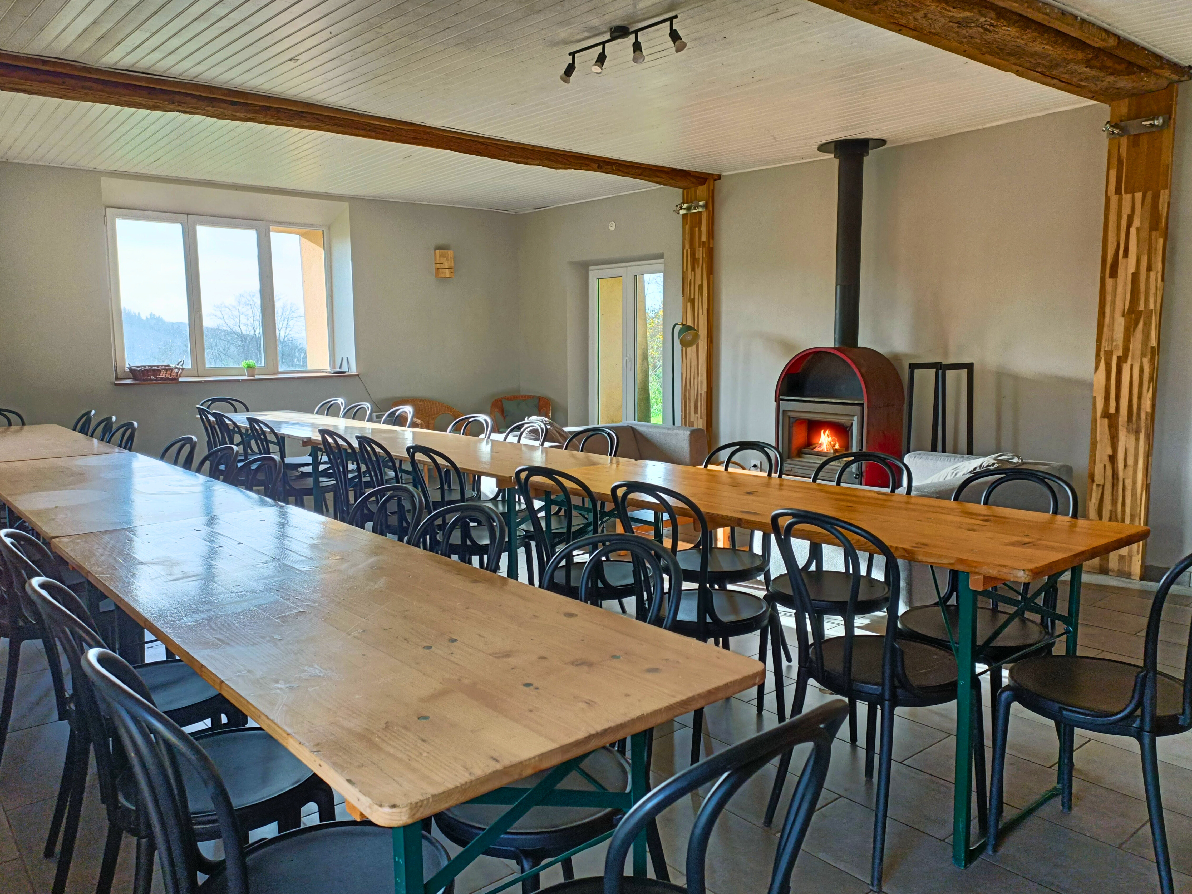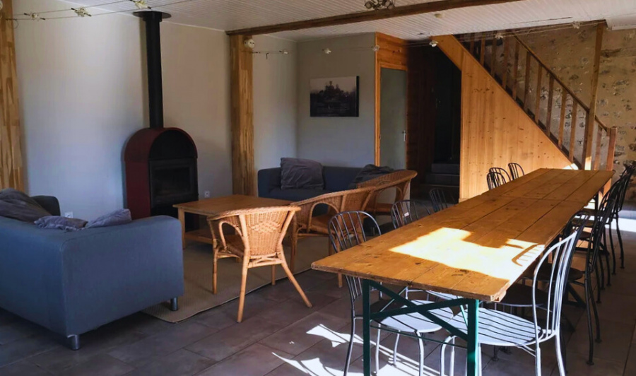 Cette ferme rénovée de plus de 300 m² dispose d’une vaste cuisine et d’une grande salle de réception avec poêle à bois, idéale pour accueillir jusqu’à 40 personnes.