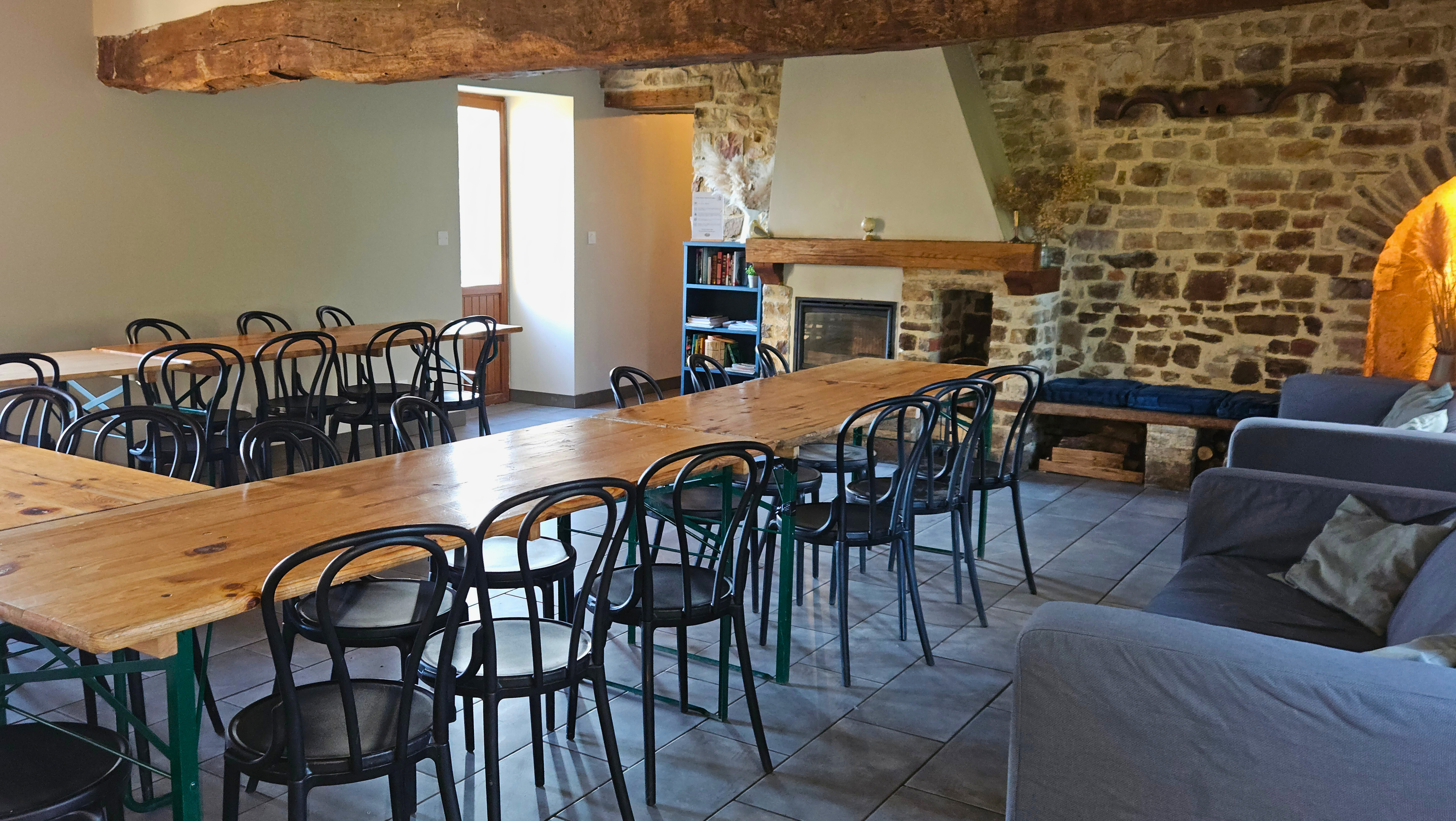 Salle de réception de 40m2 avec coin cheminée et cuisine équipée permettant d'accueillir jusqu'à 30 personnes assises.