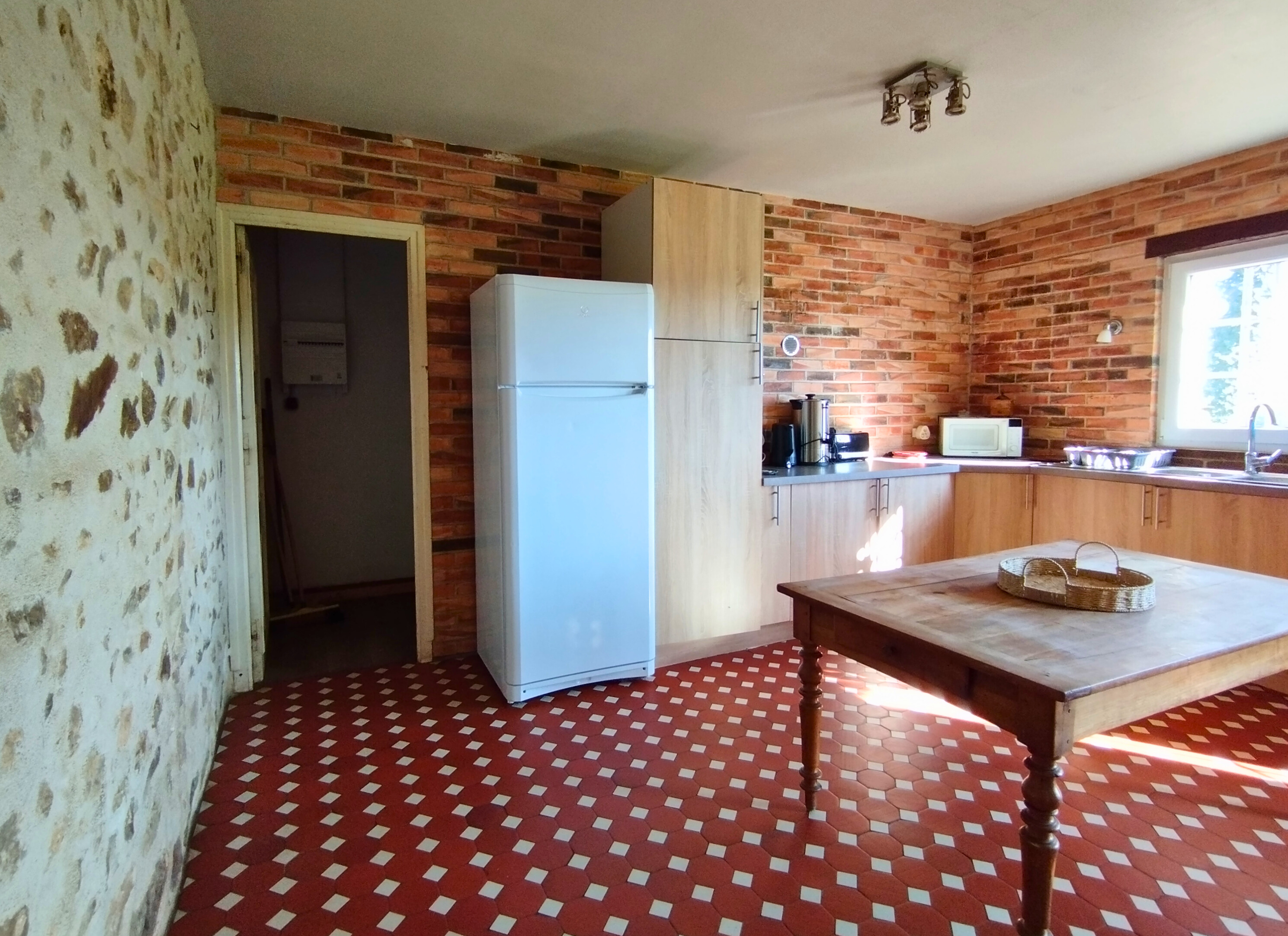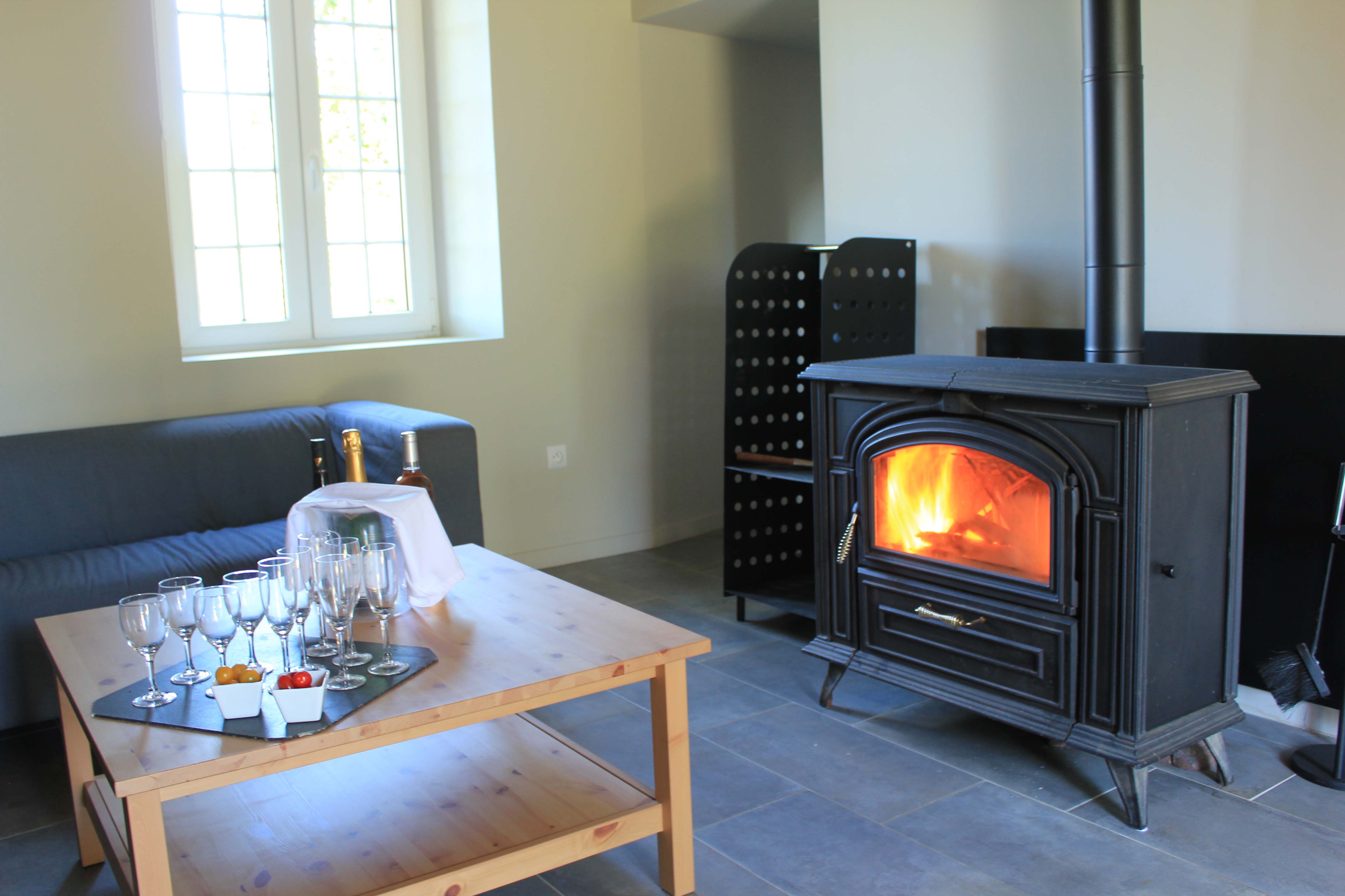 Le Gîte dispose d’un salon de 40 m² avec poêle à bois central, poutres apparentes et cuisine ouverte équipée. La salle de réception peut accueillir 15 personnes assises.