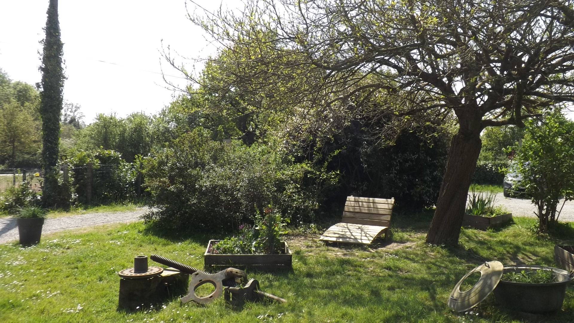 La Faërie, c'est un hectare de nature ; avec son verger, son coin dédié aux petits animaux de la ferme (poules d'agrément, canards, lapins), des prés avec poneys, chèvres et poules, un bois, et un espace jeux dédiés aux enfants clos et aménagé.