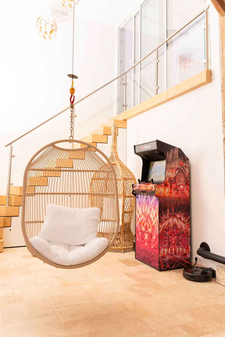 Nombreux équipements : Tablette connectée et enceintes Alexa, douche à l'italienne, WC japonais, borne d'arcade avec 15.000 jeux, karaoké professionnel, sac de boxe qui descend du plafond avec une télécommande !