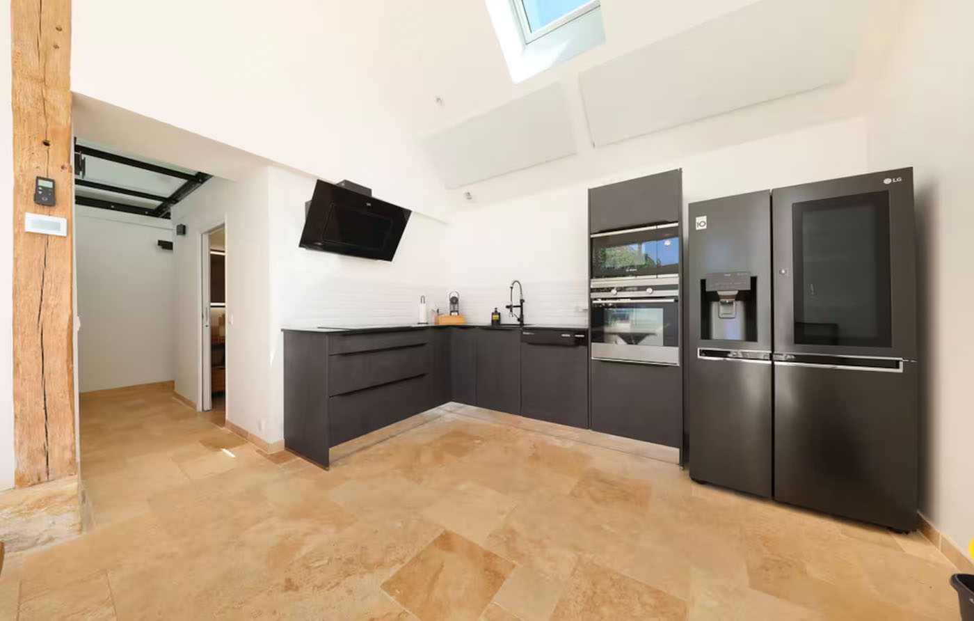 Immense terrasse de 130m2 avec cuisine d’été exterieure avec plancha, evier, frigo, four a pizza.
