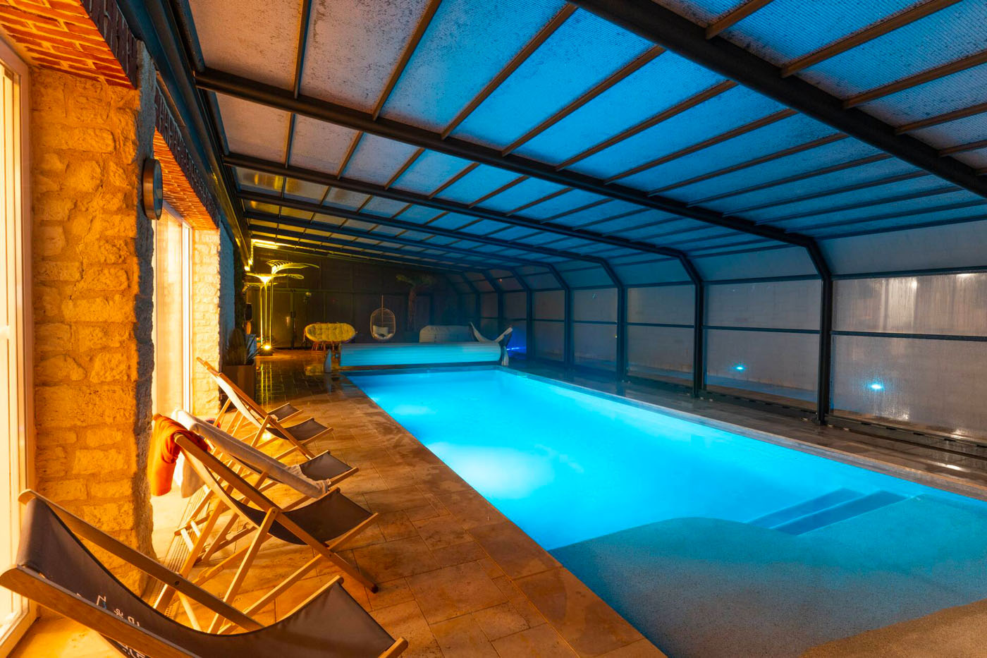La piscine couverte est équipée d'une nage à contre courant, transats ou hamac vous permettront de vous relaxer.