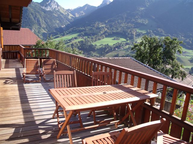 Du balcon vue imprenable sur les montagnes envrionnantes et jsuqu'au haut du Col des Aravis.