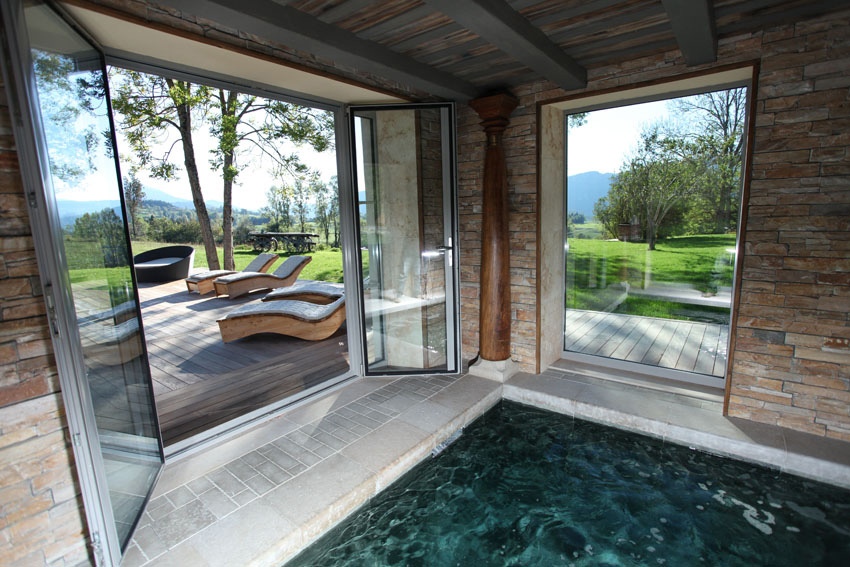 La piscine couverte chauffé toute l’année est à votre disposition, autour des trois terrasses.